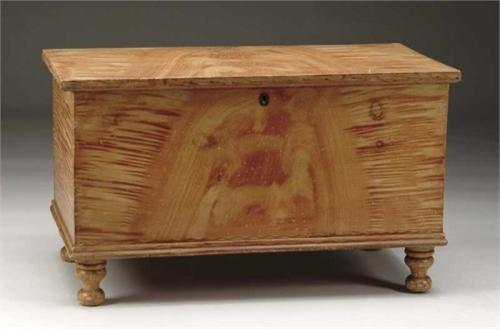GOOD GRAIN PAINTED LIFT TOP BLANKET CHEST. Applied molded edge top, lidded till, six board chest rests on four turned feet. The tiger and birdseye maple grain painting in color of orange on yellow/ivory. SIZE: 22-1/4” h x 38” at widest x 20-3/4”. CONDITION: Very good. Attractive paint decoration. 9-27503