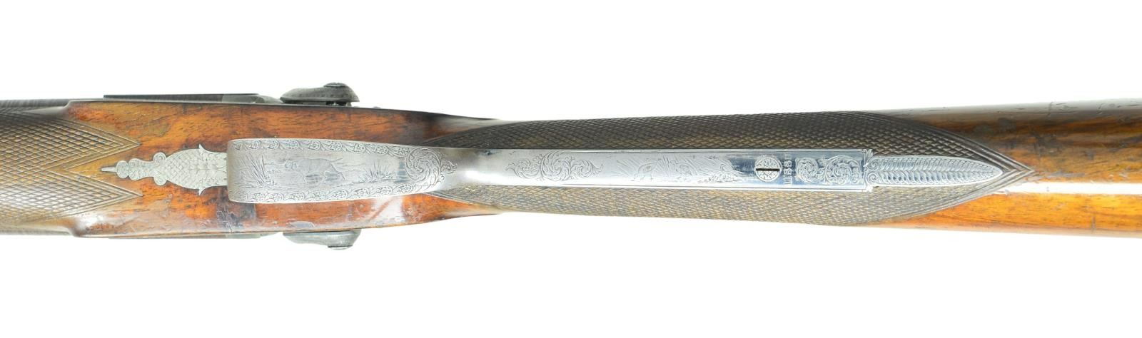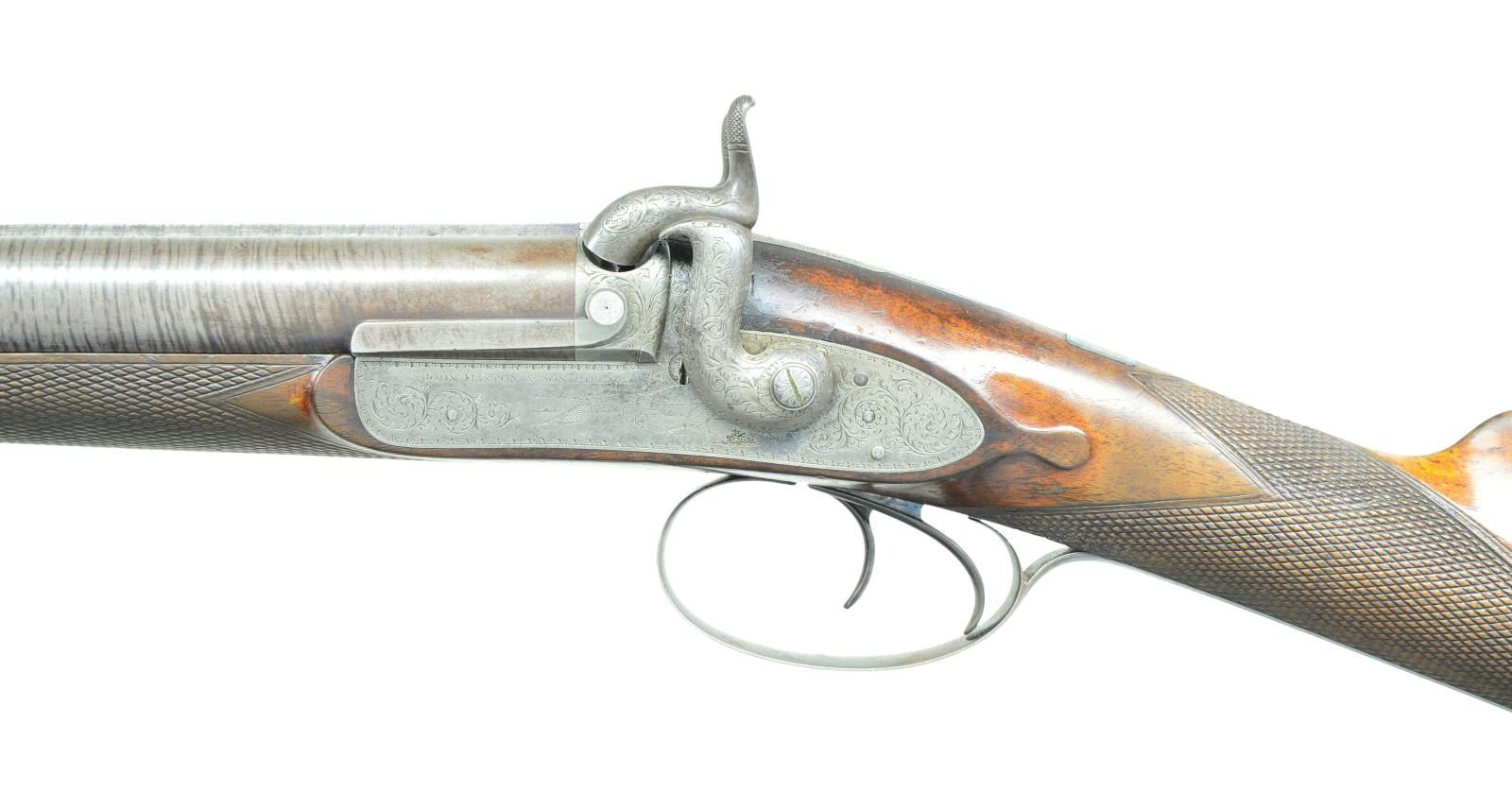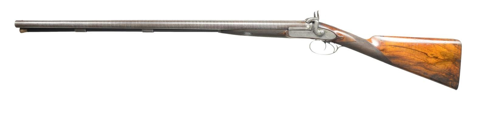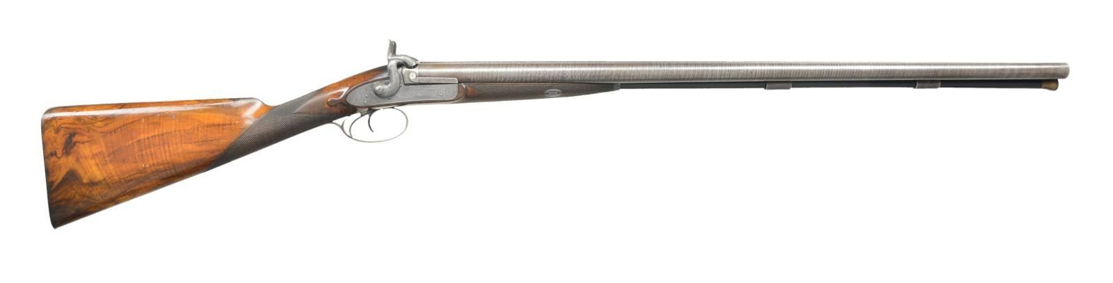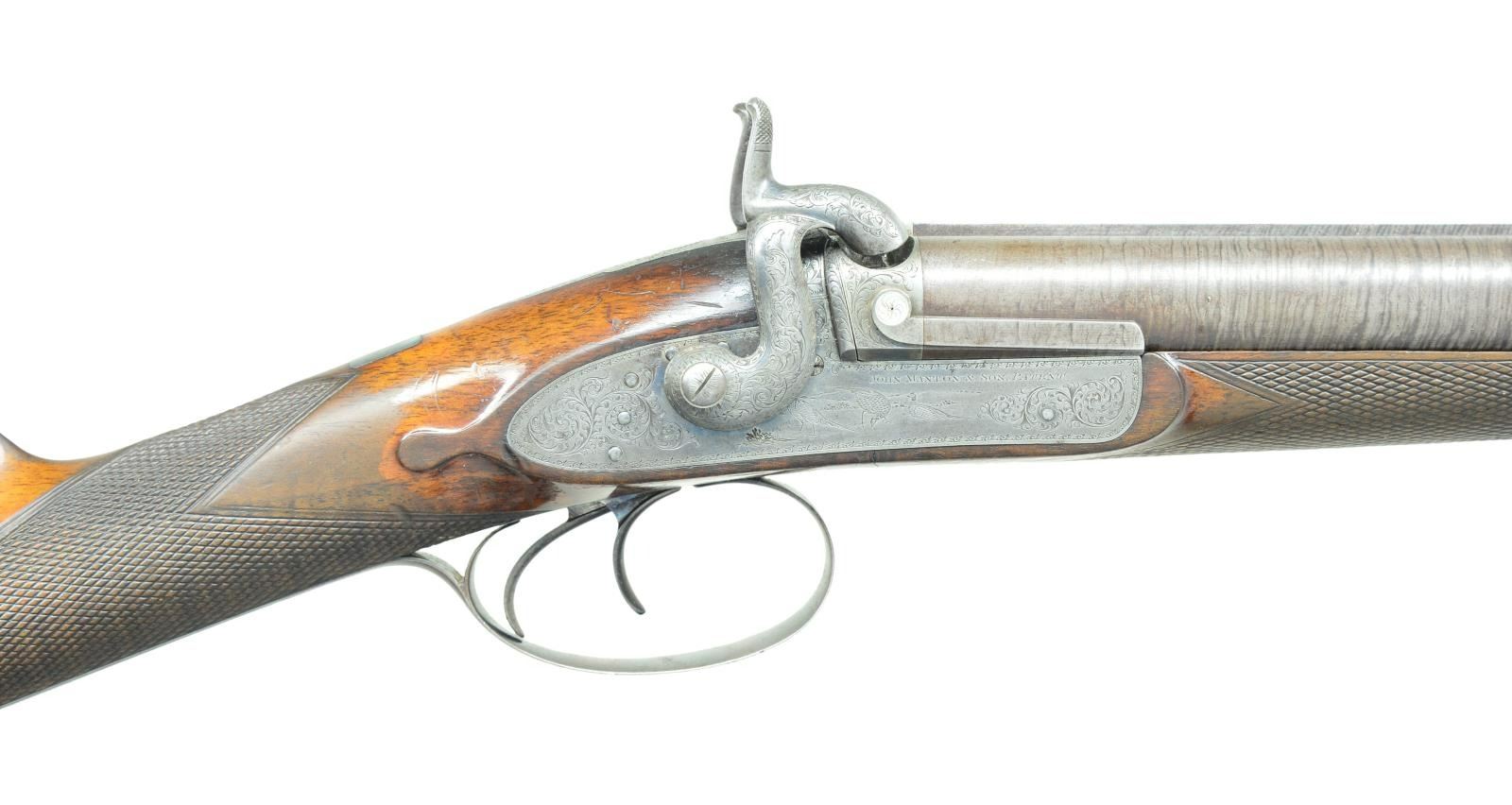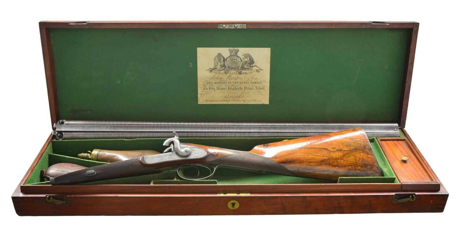 WITH ORIGINAL CASE AND ACCESSORIES. Cal. 13 bore. S# 11880 (CA 1840). The 30" twist barrels are engraved "John Manton & Son Dover Street London" on slightly raised wide game rib. Bottoms of barrels are stamped with London proofs and "J.M.". Breeches, with vented platinum blow outs, have some scroll engraving on sides as well as on rib extension. Breech iron is engraved with near full coverage well cut scroll and a sleeping bunny. Front spring locks with round bodied serpentine hammers are engraved with more matching scroll and game birds. Each plate is engraved "John Manton & Son, Patent". Trigger plate has fancy pineapple type finial, trigger guard is engraved with pointing pointer on bow, game birds and S# on tang. Stock of attractive fiddle figured and well marbled European walnut measures 14 1/2" over steel buttplate with long top tang engraved with spaniel chasing a pheasant. Stock has point pattern checkering at grip and forend. A vacant silver oval is at top of grip. Stock attaches to barrels with captive sidebolt through oval silver escutcheons. Ebony ramrod with brass tip and tail (worm under tail) mounts through two plain pipes and pineapple thimble. MEASUREMENTS: STOCK: DAH: 1 3/4". DAC: 1 7/16". CAST: neutral. LOP: 14 1/2". WEIGHT: 7 lb. 6 oz. UNATTACHED ACCESSORIES: gun is housed in what appears to be its original quilt figured mahogany case with dual hook and key lock closure. A circular "D" ring handle is on lid. Case is lined in green cloth and has John Manton label is in top as used after 1840. Bottom compartment fits gun perfectly and contains a good array of correct vintage accessories including spare ramrod, copper bodied powder flask by Sykes, unmarked leather shot flask, two piece brass and cocobolo cleaning rod, brass and ebony powder measure, ebony handled nipple wrench, and small turn screw stamped "D. Oyly". A removable compartment with sliding cover at right contains a bag of wads, mop, jags, Turks head and spare main springs. A circular wad in bottom is inscribed with what appears to be this guns S#. CONDITION: good. Barrels retaining most of their original brown with good definition to pattern. Other metal parts retain traces of their original finish but are mostly gray-brown. Stock retains most of its varnish finish with a large number of small marks and dings. Bores are shiny, lightly frosted throughout. Locks are fine. Exterior of case is very fine retaining what appears to be most of its original varnish finish. Interior cloth is very good to fine with some rubs and soiling. Label is lightly foxed and soiled. Accessories are generally good. (01-21930/MGM). ANTIQUE. $3,500-5,500.