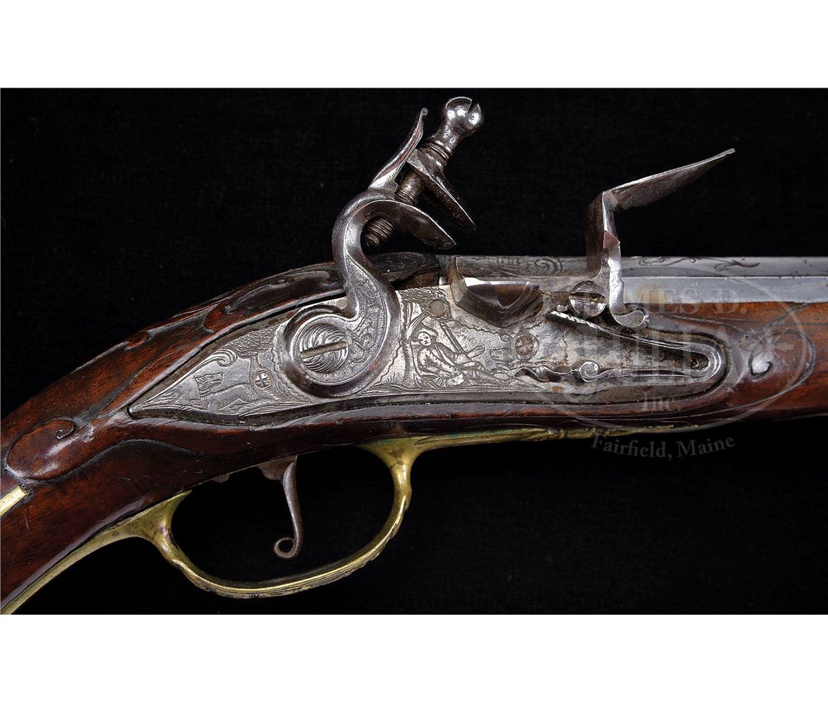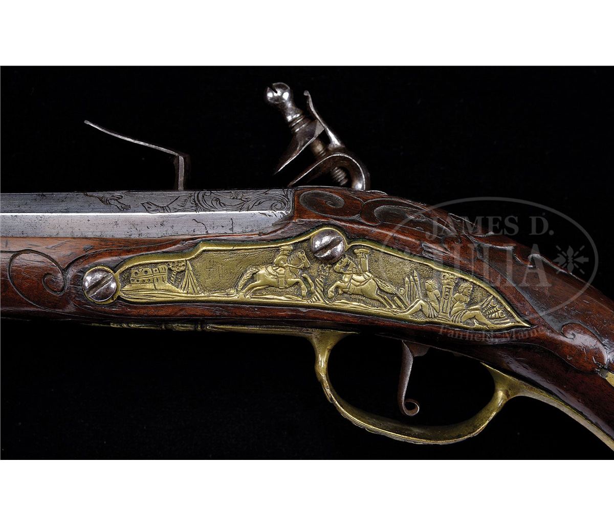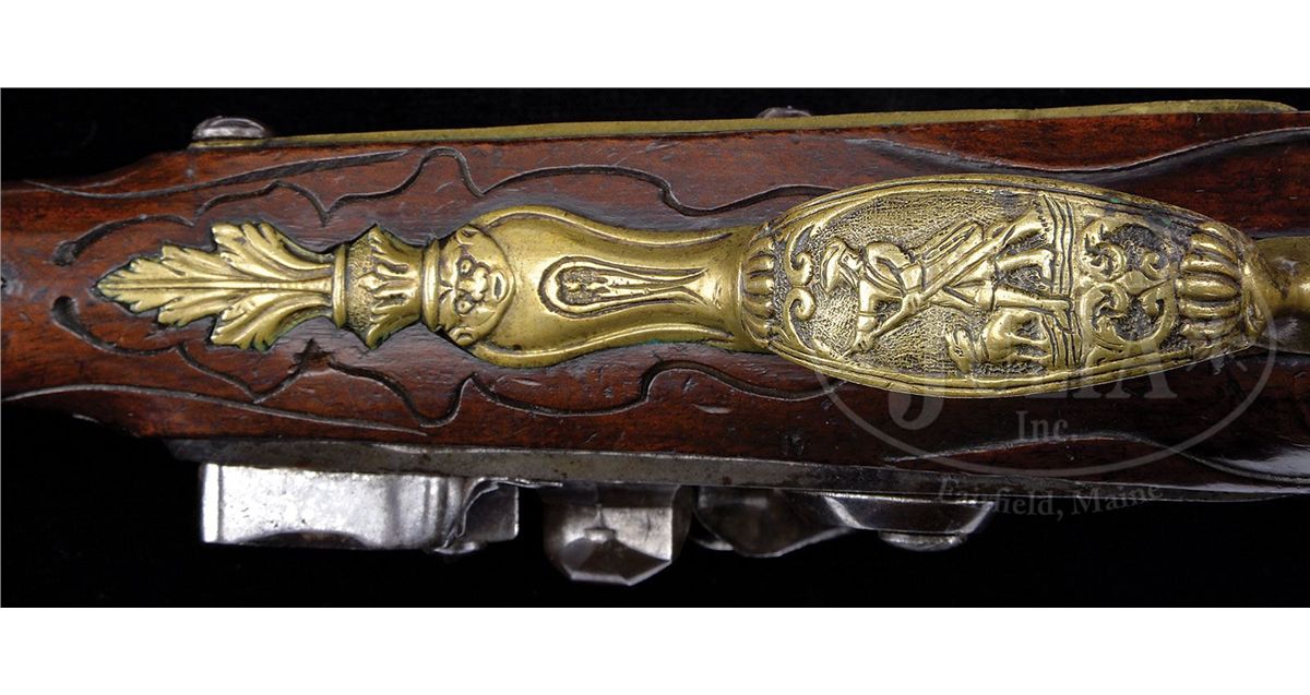 NSN. Locks are finely engraved in the Carlsbad style with a reclining gentleman with his dogs in the woods. Cock engraved with dog. Frizzens are faceted but unengraved. Breeches of bbl are engraved with a gentlewoman holding out her hand to a dog. Oct to 16 sided to round bbls. Full brass mounts cast with hunting figures and gentlemen dueling on horseback and a European firing his pistol at a turbaned Turk on horseback. Spurred butt caps with mask pommels in raised relief. Sideplate with two mounted gentlemen in combat and two bound slaves. Walnut full stocks incise carved and molded with horn. Forend tips and horn tipped ramrods. PROVENANCE: Dr. John Hill Collection. Collection of Dr. Douglas Sirkin. CONDITION: Metal brightly polished but engraving still has good definition. Actions are crisp. Brass mounts retain nice patination. Stocks are crisp retaining much original finish. Minor chip repaired to one at front of lock on both pistols. Minor amount of fill on left side of one pistol. Otherwise generally rated very good. 4-49752 MZ46
