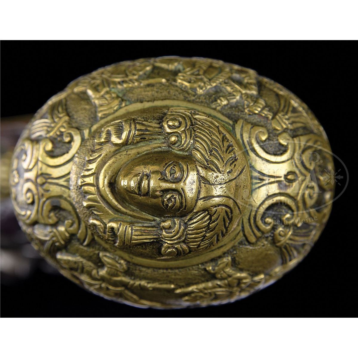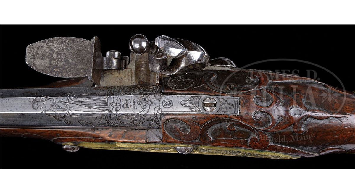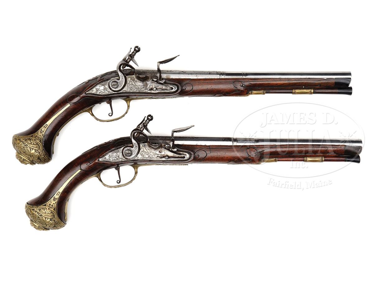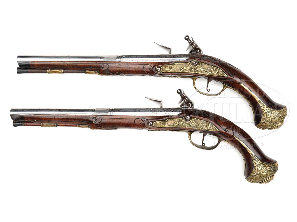 NSN. Locks are finely engraved in the Carlsbad style with a reclining gentleman with his dogs in the woods. Cock engraved with dog. Frizzens are faceted but unengraved. Breeches of bbl are engraved with a gentlewoman holding out her hand to a dog. Oct to 16 sided to round bbls. Full brass mounts cast with hunting figures and gentlemen dueling on horseback and a European firing his pistol at a turbaned Turk on horseback. Spurred butt caps with mask pommels in raised relief. Sideplate with two mounted gentlemen in combat and two bound slaves. Walnut full stocks incise carved and molded with horn. Forend tips and horn tipped ramrods. PROVENANCE: Dr. John Hill Collection. Collection of Dr. Douglas Sirkin. CONDITION: Metal brightly polished but engraving still has good definition. Actions are crisp. Brass mounts retain nice patination. Stocks are crisp retaining much original finish. Minor chip repaired to one at front of lock on both pistols. Minor amount of fill on left side of one pistol. Otherwise generally rated very good. 4-49752 MZ46