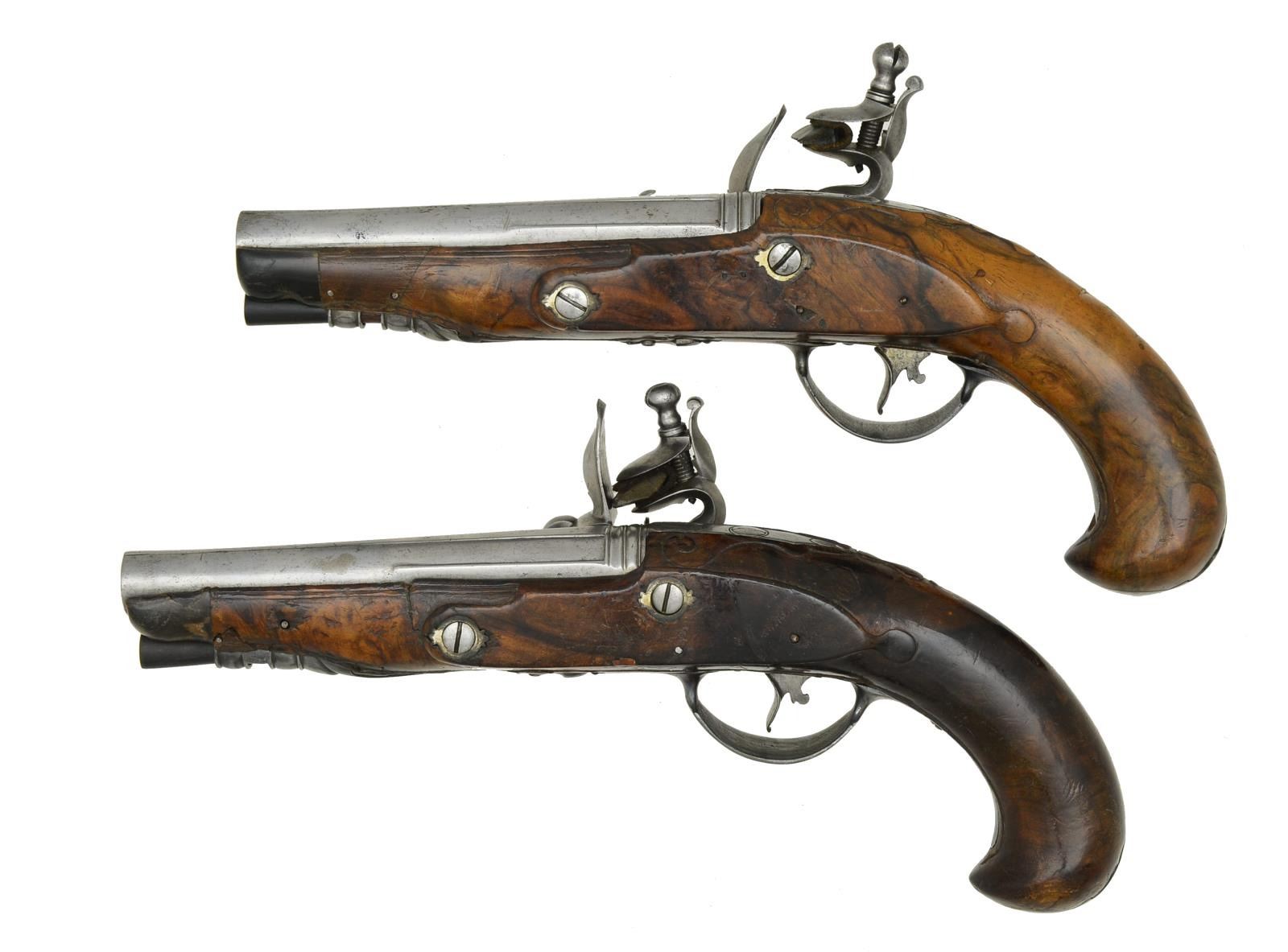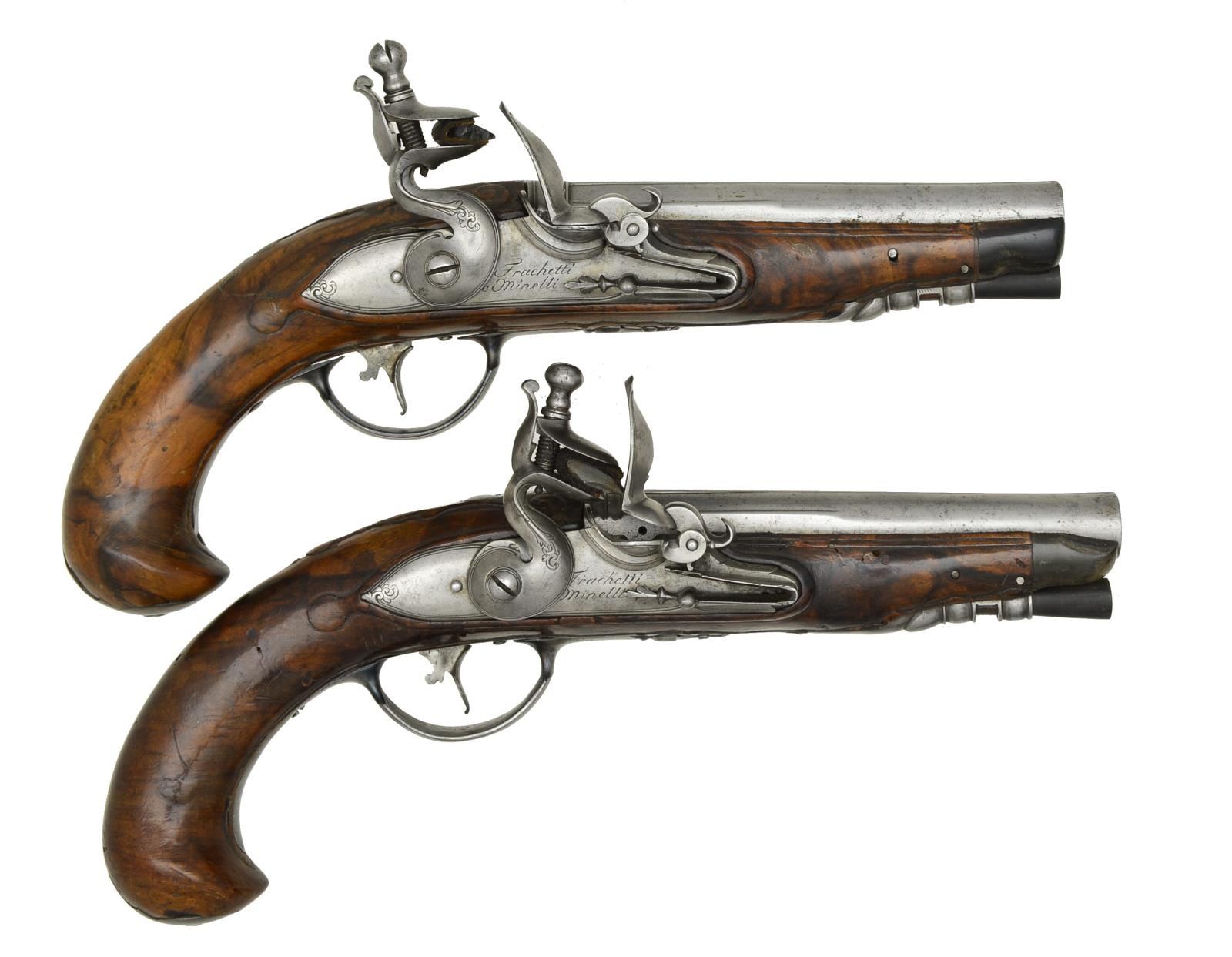 FRACHETTI & MINELLI OF BRESCIA. Cal. 48. NSN. Pistols are 9 1/2" overall & have 4 3/4" steel bbls. that have well filed in top ribs. Locks w/ rnd. body plates have serpentine cocks. Inset rounded pans. Bridled friction frizzens & file decorated feather spring w/ foliate finials. Locks are line border engraved w/ some flourishes of scroll. “Frachetti e Minelli” (working circa 1786-1812) engraved on each plate under pans. Stocks of burl walnut have birds head grips & extend to muzzles w/ horn tips. There are raised carved fields around locks & trigger guards & some raised foliate carving at bbl. tangs. Pistols are iron mounted. Trigger guards have relief filed finials. Walnut ramrods w/ horn tips are held by 1 piece beaded pipes & thimbles. CONDITION: very good to fine. Iron parts w/ smooth, gray, cleaned patina. Stocks w/ most of their original French polish finish are sound. One pistol has sm. resin infill on left side near forend tip. Mechanically good. (01-19389(2)/MGM). ANTIQUE. $1,500-2,500.