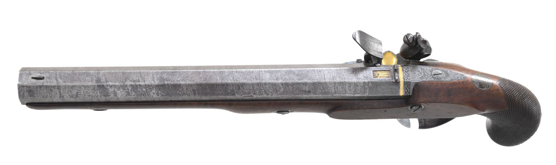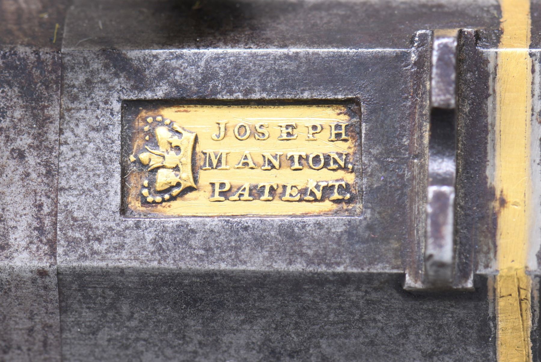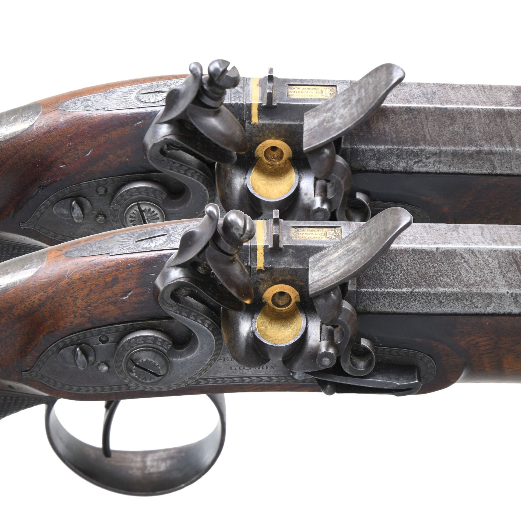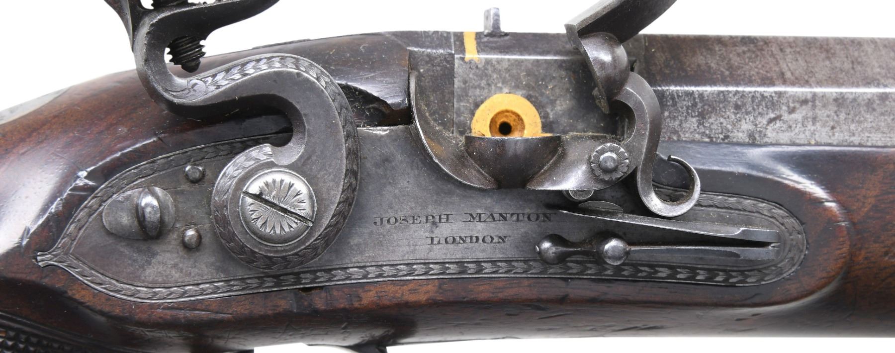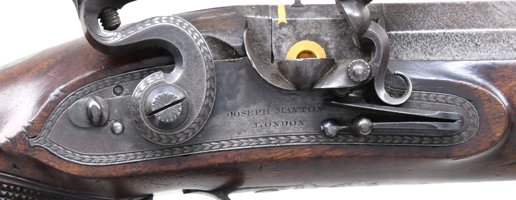 DUELLING OR HOLSTER PISTOLS EX BEDFORD COLLECTION. Cal. 54 (both). S# 305 (both). 10" twist octagon barrels with scratch rifling are unmarked on tops. Gold poincon on tops of breeches are marked "Joseph Manton Patent". Gold lines are at rears. Breeches are inset and gold touch holes are recessed. Breech irons are engraved with stands of arms. Small locks with flat plates are fitted with serpentine cocks, with back sliding safetys, gull wing type gold lined semi-waterproof pans, bridled roller frizzens and feather springs with bulbous finials. Locks are feather border engraved with "JOSEPH MANTON" "LONDON" under pans. Trigger plates have pineapple finials. Trigger guards are engraved with stands of arm. Stocks extend to muzzles in early fashion and have checkered bag grips with steel caps engraved with crossed arrow and club devices. S#'s are not visible with out barrel removal. Silver ovals at tops of grips are engraved with the crown of a viscount over what is reported to be the Hamilton family crest. Stocks attach to barrels with two captive sidebolts through oval silver escutcheons. Hickory ramrods with horn tips mount through beaded pipes and matching thimbles. These guns are listed on page 215 of "The Manton Supplement" as being made in 1791 with a brief description and at the time were owned by C. P. Bedford USA (famous collection and book "Early Firearms of Great Britain and Ireland from the Collection of Clay P. Bedford"). CONDITION: good. Metal retaining traces of original finishes showing considerable wear and cleaning to gray-brown. A good deal of temper blue remains on feather springs. Stocks retain most of what is probably an old oil refinish with many marks and scratches. A 2" x 1/4" piece of wood is missing from left front barrel channel of one pistol with crack continuing for another 2", otherwise stock is sound. The other pistol shows some cracks toward muzzle but no missing wood. Locks and frizzens are crisp. Safetys do not slide easily. Scratch rifled bores are dark with scattered pitting. (01-26466 & 01-26467/MGM). ANTIQUE. $6,000-8,000.