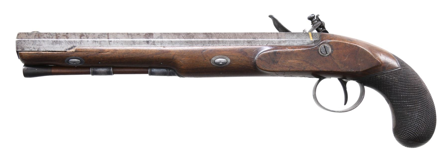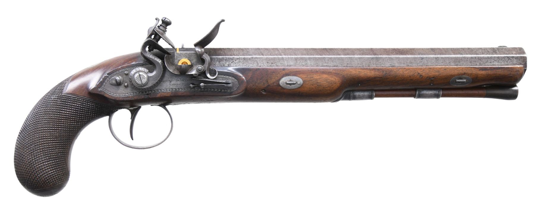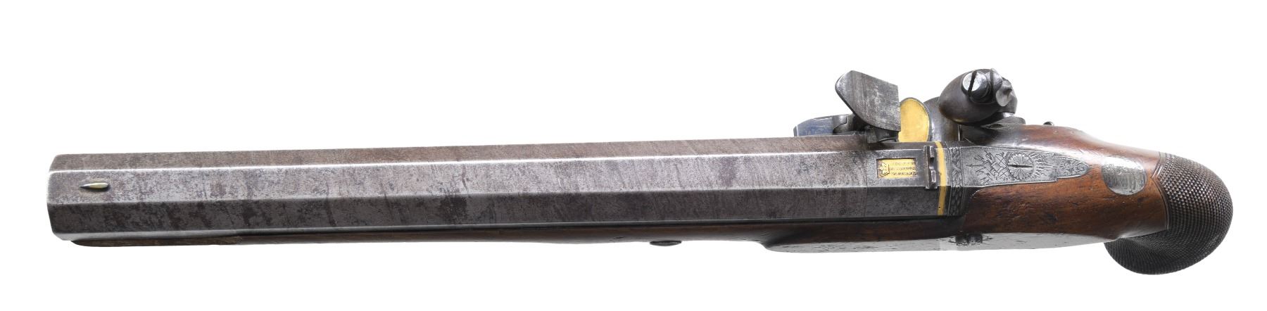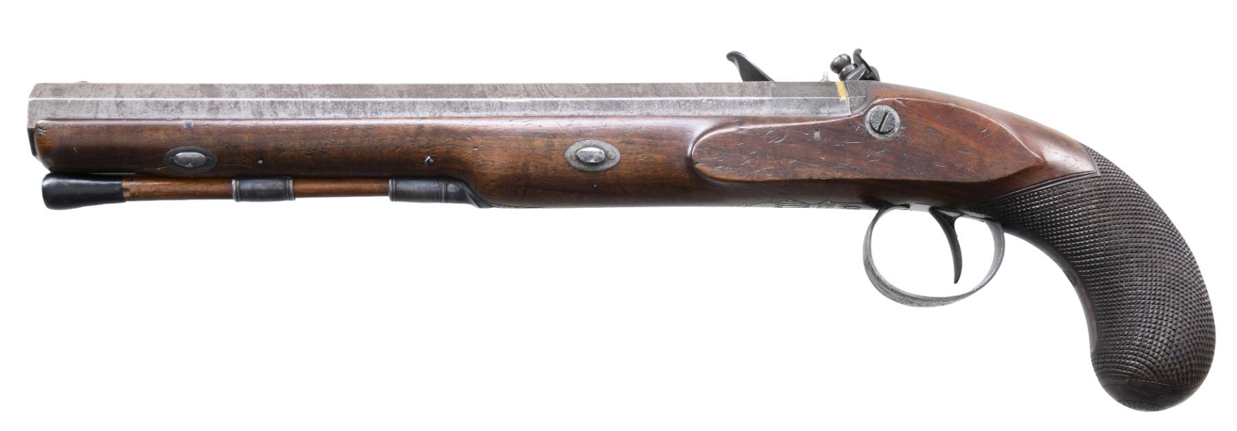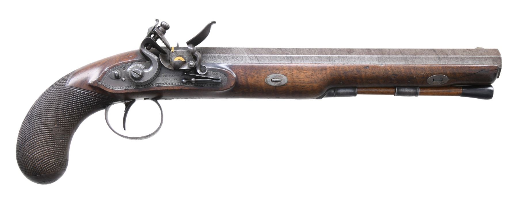 DUELLING OR HOLSTER PISTOLS EX BEDFORD COLLECTION. Cal. 54 (both). S# 305 (both). 10" twist octagon barrels with scratch rifling are unmarked on tops. Gold poincon on tops of breeches are marked "Joseph Manton Patent". Gold lines are at rears. Breeches are inset and gold touch holes are recessed. Breech irons are engraved with stands of arms. Small locks with flat plates are fitted with serpentine cocks, with back sliding safetys, gull wing type gold lined semi-waterproof pans, bridled roller frizzens and feather springs with bulbous finials. Locks are feather border engraved with "JOSEPH MANTON" "LONDON" under pans. Trigger plates have pineapple finials. Trigger guards are engraved with stands of arm. Stocks extend to muzzles in early fashion and have checkered bag grips with steel caps engraved with crossed arrow and club devices. S#'s are not visible with out barrel removal. Silver ovals at tops of grips are engraved with the crown of a viscount over what is reported to be the Hamilton family crest. Stocks attach to barrels with two captive sidebolts through oval silver escutcheons. Hickory ramrods with horn tips mount through beaded pipes and matching thimbles. These guns are listed on page 215 of "The Manton Supplement" as being made in 1791 with a brief description and at the time were owned by C. P. Bedford USA (famous collection and book "Early Firearms of Great Britain and Ireland from the Collection of Clay P. Bedford"). CONDITION: good. Metal retaining traces of original finishes showing considerable wear and cleaning to gray-brown. A good deal of temper blue remains on feather springs. Stocks retain most of what is probably an old oil refinish with many marks and scratches. A 2" x 1/4" piece of wood is missing from left front barrel channel of one pistol with crack continuing for another 2", otherwise stock is sound. The other pistol shows some cracks toward muzzle but no missing wood. Locks and frizzens are crisp. Safetys do not slide easily. Scratch rifled bores are dark with scattered pitting. (01-26466 & 01-26467/MGM). ANTIQUE. $6,000-8,000.