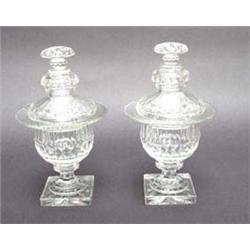 GOOD PAIR OF VICTORIAN IRISH STYLE VASES AND COVERS, the goblet shaped bodies with broad rims, on square bases, the covers with mushroom and vase knops, cut all over with bands of diamonds and slice cut grounds, 12 in. See illustration.