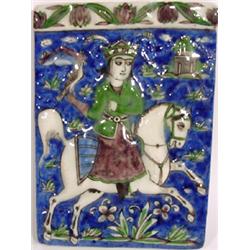 GOOD PERSIAN QUAJAR PERIOD HAND-PAINTED AND GLAZED PORCELAIN TILE DEPICTING A YOUNG PRINCE ON HIS HORSE WITH HIS PET FALCON, 19th century; 8-1/2 inch height; 6 inch width