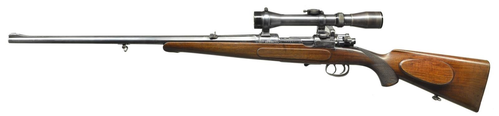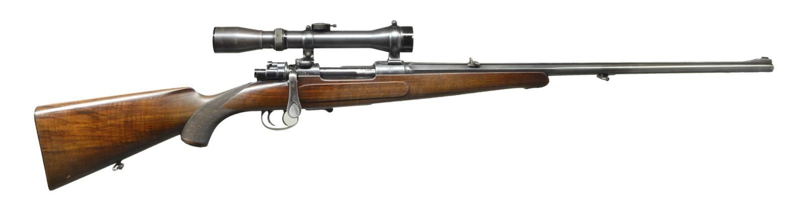 BRAUN & MUNZEL WITH SCOPE. Cal. 9x57 Mauser, Groove Diameter: .358. S# 5112AH. Most likely built after World War I on a military action, this rifle has 23" half rnd. half octagon ribbed barrel fitted with 1 standing 1 folding leaf U-notch rear and silver bead front sights. Maker’s name is toward right side of rib and address “Coblenz” is toward left. Standard length Model 98 action is fitted with claw scope bases. Bolt handle has been altered to butterknife type. Bottom metal has added lever to remove floorplate. Trigger guard bow has been nicely shaped and double set triggers are fitted. Action and bottom metal are lightly engraved with sprays of scroll and line borders. Horn capped pistol grip stock of lightly figured European walnut measures 13 7/8" over basketweave horn buttplate and features small shadowline right hand cheekpiece, schnabeled forend tip, reinforcing side panels, and point pattern checkering at grip. Sling loops are installed on toeline and bottom of bbl. Action is mounted with Hensoldt Dialytan 4x scope with 3 post reticle in claw mounts, rear with windage. CONDITION: very good to fine, metal parts retaining over 70% original blue. Stock with nearly all of its original oil finish has a good scattering of minor dents and marks. Checkering is lightly worn. Bore is bright and shiny but shows some erosion at throat. Mechanically good. Scope is good to fine, with most of its exterior blue, which has browned considerable on ocular bell. Optically good, fairly clear. (22-5421/MGM). CURIO. $1,000-1,500.