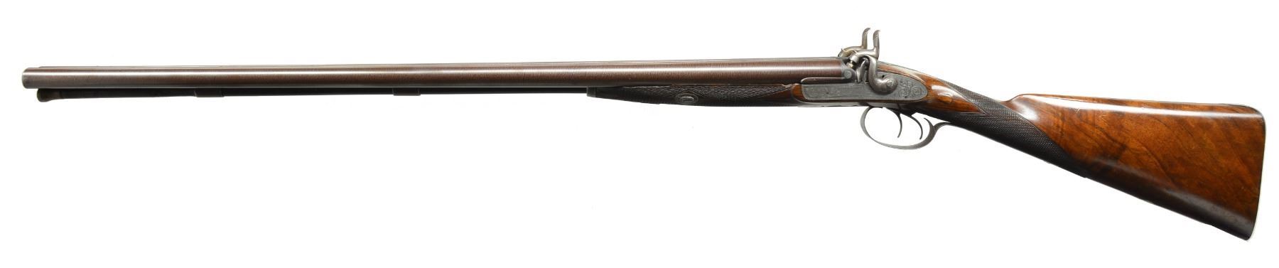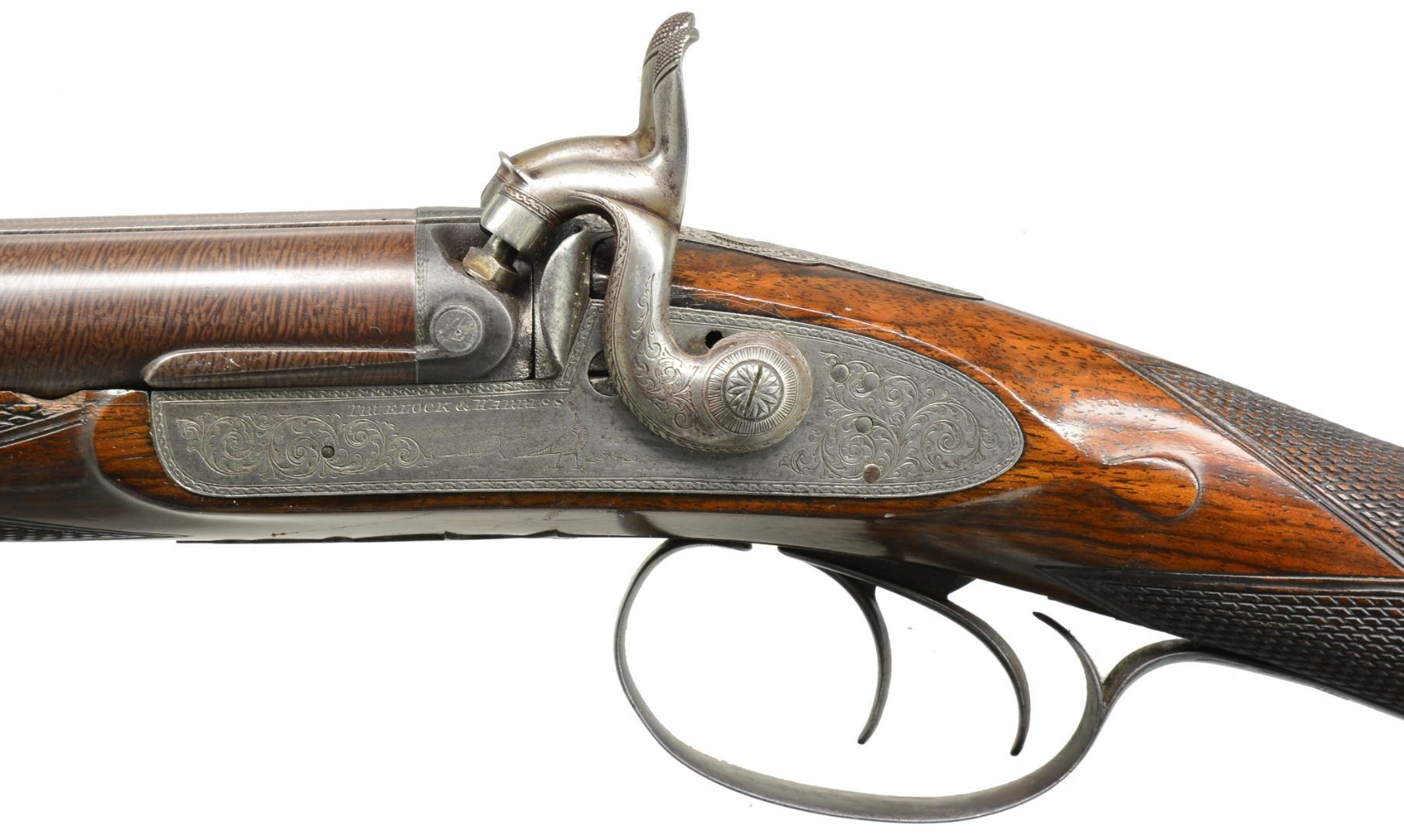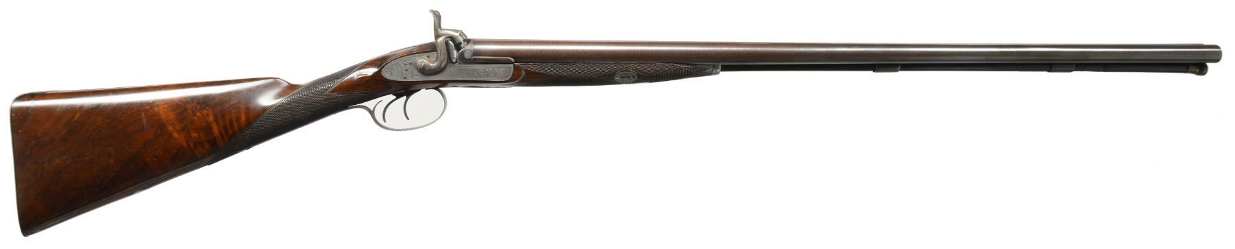 & HARRISS OF DUBLIN. Cal. 14 Bore. S# 6373. Nicely patterned 30" Damascus bbls. engraved w/ makers name & Dublin address on narrow top rib. Trulock & Harriss were working between 1842 & 1900 & were quite highly regarded. Breech plugs have vented platinum blow outs. Breech iron is very nicely engraved w/ shaded scroll. Lockplates are engraved w/ lg. open scroll at either end framing bird scenes under "Trulock & Harriss". Round bodied serpentine hammers are also scroll engraved. Stock of nicely figured European walnut measures 14 3/8" over engraved steel buttplate. Other furniture is of iron & trigger plate has nicely engraved fancy filed finial matching thimble. Blued trigger guard is engraved w/ dogs on bow. S# is on tang. Nicely cut flat top point pattern checkering is at grip & forend. Stock attaches to bbls. w/ usual side bolt through oval steel escutcheons. An ebony ramrod w/ brass head & tail (worm under cap) is held by 2 plain pipes. Minimum wall thickness: left - .022, right - .022. DAH: 2 3/16". DAC: 1 1/2". WEIGHT: 6 lbs. 8 oz. CONDITION: good, as refurbished. Bbls. retain nearly all of a good quality rebrown w/ dramatic twist figure. Most other metal is cleaned to silver gray. Trigger guard has been temper blued. Stocks retain most of an old oil refinish. Checkering nicely recut. Hammers have been replaced & are loose on tumblers but match well. Bores appear to be good, lightly pitted. (01-17416/MGM98). ANTIQUE. $1,000-1,500.