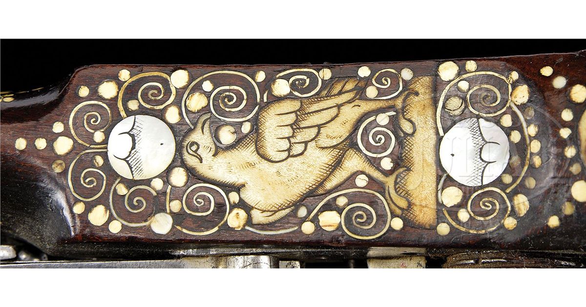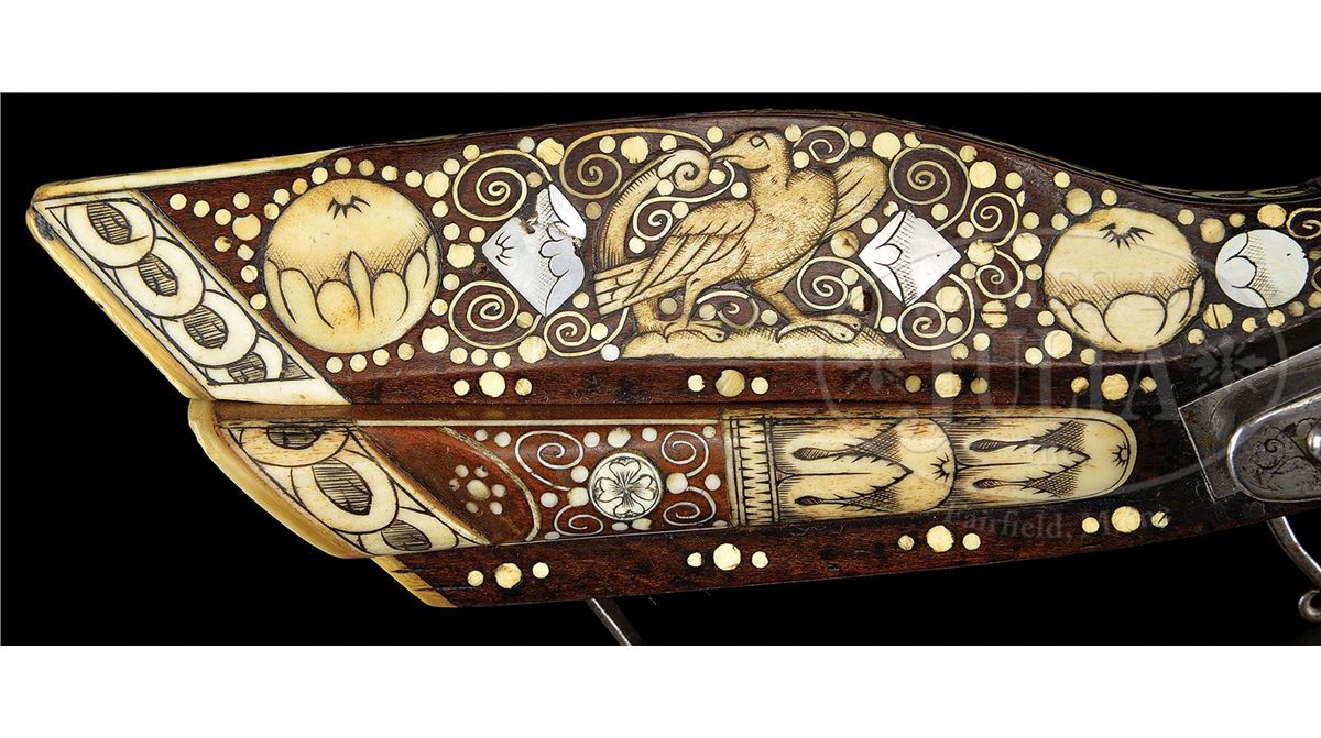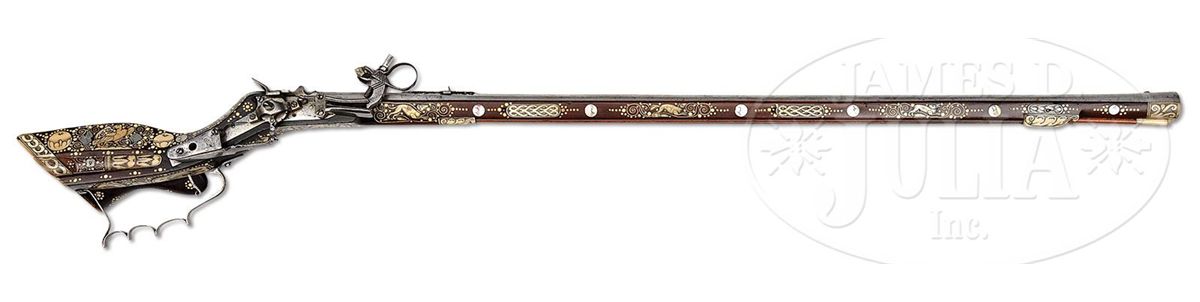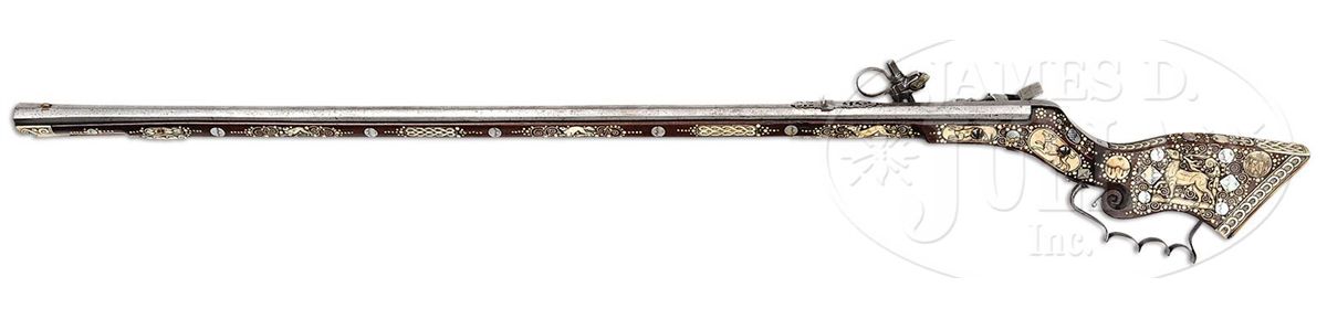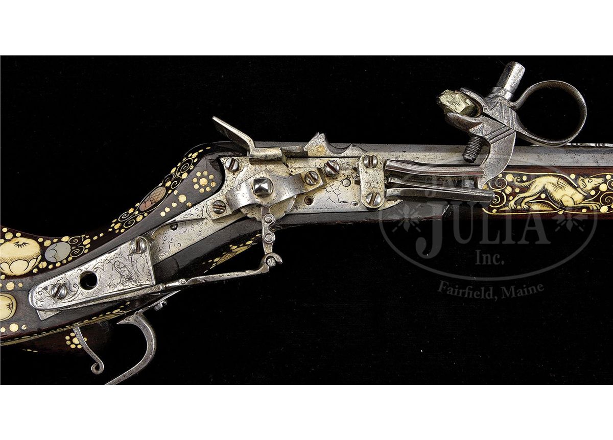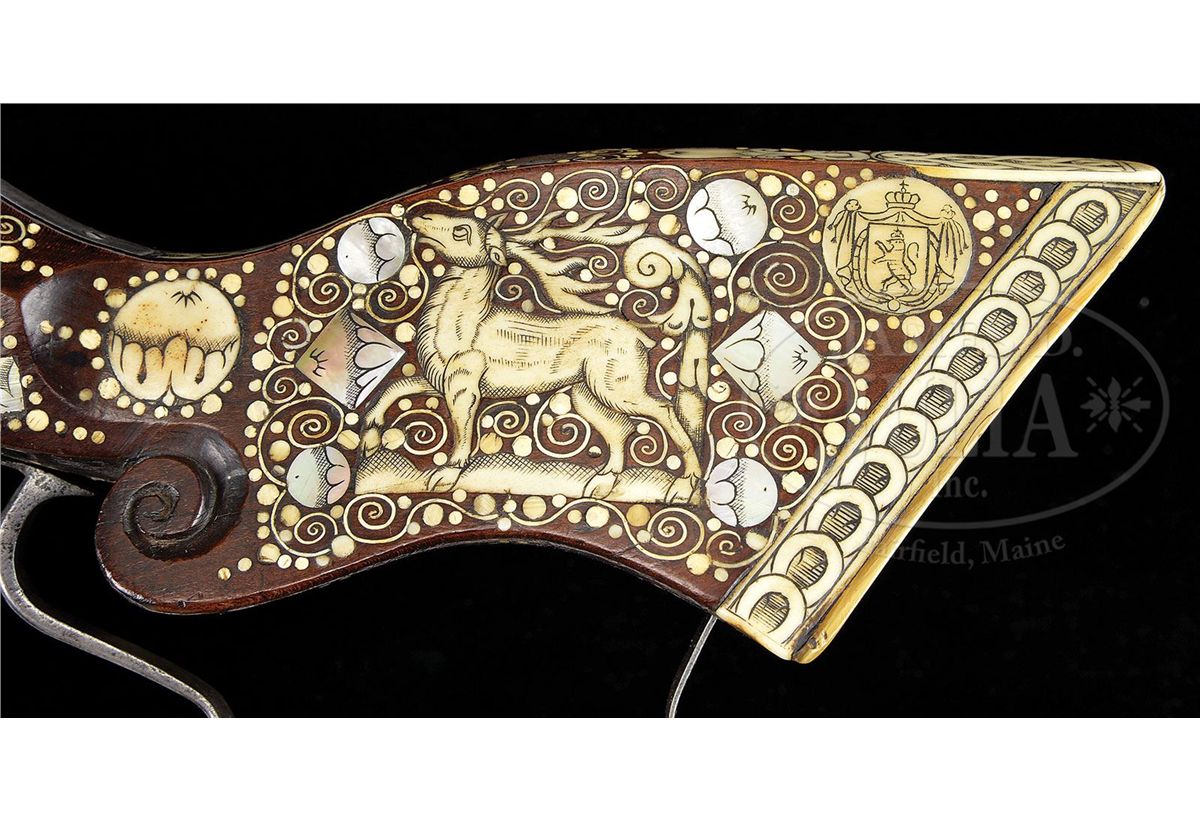 NSN. Fruitwood stock elaborately inlaid with eagle, large stag, dogs, rabbits, expanded flowers, tendrils and white stag horn pellets. Engraved rondels of pearl separate white stag horn panels along forend and on butt. Scrimshaw of stag horn very well executed throughout and remains in crisp condition. Oct bbl of typical form. Small bore with elaborately pierced rear sight. Lock retains traces of original engraved decoration. All small parts original. PROVENANCE: Collection of Dr. Douglas Sirkin. CONDITION: Gun remains in good original condition throughout with virtually no replaced inlay. Metal is cleaned, bright on lock bbl and trigger guard. Pan and pan cover remain in good original condition with crisp engraving. 4-49904 MZ3