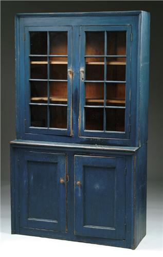 GOOD TWO PART STEPBACK CUPBOARD IN BLUE PAINT. Early 19th C with an old blue paint which possibly could be original. The top section with two eight-pane glass doors fitted with wood knobs. Two shelves behind. The front frame with a decorative molding. The bottom section with two paneled doors having molded panel edges, each fitted with wood knob, behind which is one shelf. Nice blue paint. SIZE: 81-1/2in. h x 47-1/2in. w. Bottom is 17-1/2in. d; top is 12-3/4in. d. CONDITION: Overall very good. 9-25988