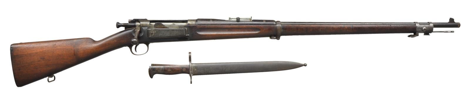 ACTION RIFLE WITH 1894 DATED BAYONET. Cal. 30-40 Krag. S# 11274. The 30" bbl. with uncrowned muzzle is fitted with correct type stepped rear sight and handguard which does not go over receiver ring. Action is marked “1894”, “U.S. SPRINGFIELD ARMORY” and with serial number. Bolt is unaltered with flat extractor and no provision for takedown. Action does not have notch. Safety is of early style retained by a pin and housing has turned rings at rear. Early style stock with flat butt has buttplate without trap. Toe of butt does not show any alteration. Removal of buttplate reveals original type stock without any holes. Front band is of correct style with bump and hole for cleaning rod (steel cleaning rod present). Sharp inspector’s mark “JSA 1895” is on left side. A circled “P” is on grip. Bayonet with 11 5/8" U.S. marked blued blade is stamped “1894” on left side. Metal scabbard has symmetrical opening. Riveted on belt loop is present. CONDITION: very good, bbl. retaining traces of original blue has mostly faded to brown overall. Action shows cleaning to silver gray highlights with traces of blue remaining on extractor. Stocks retain most of their original oil finish with a good scattering of light marks. Bore is fine, shiny with some light frosting. Mechanically good. Bayonet retains most of its bright blue on blade which shows scabbard wear and sharpening. Wood of grip is good. Mounts are rusted and brown. Scabbard shows considerable overall pitting. A very rare Krag. (01-21835/MGM). ANTIQUE. $3,000-7,000.