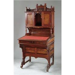 Lot # 1105 GOOD WALNUT EASTLAKE DAVENPORT SECRETARY. Bottom section with half hinged lid which opens to reveal an interior with compartments. Left compartment door, right side having two drawers. Middle section has two cupboard doors, one with segmented interior. Open alcove center. All raised above a shelf with burl panel. The galleried crest with pierced carving and central relief carved flowers. Burl panels can be seen on doors and drawers. SIZE: 64” h x 30” w x 24-1/2” d. CONDITION: Original finish with some stains and small chips. Generally very good. 9-98300 (500-1,000)