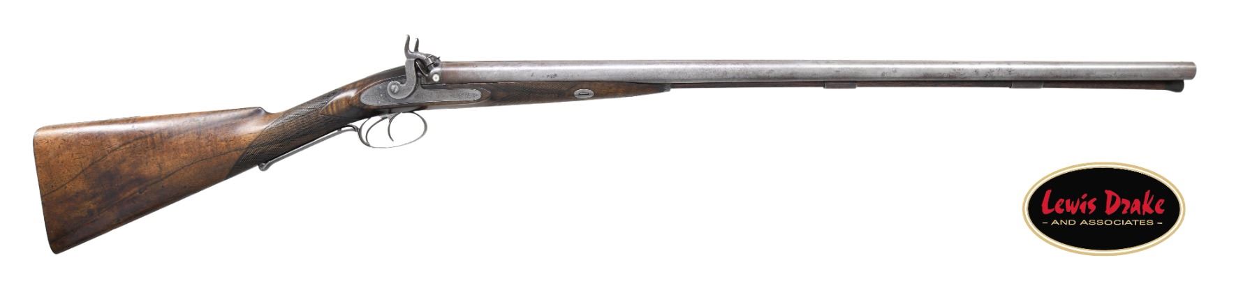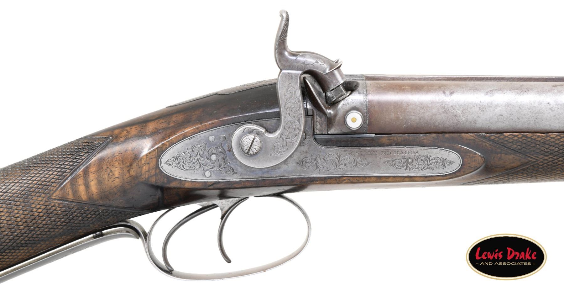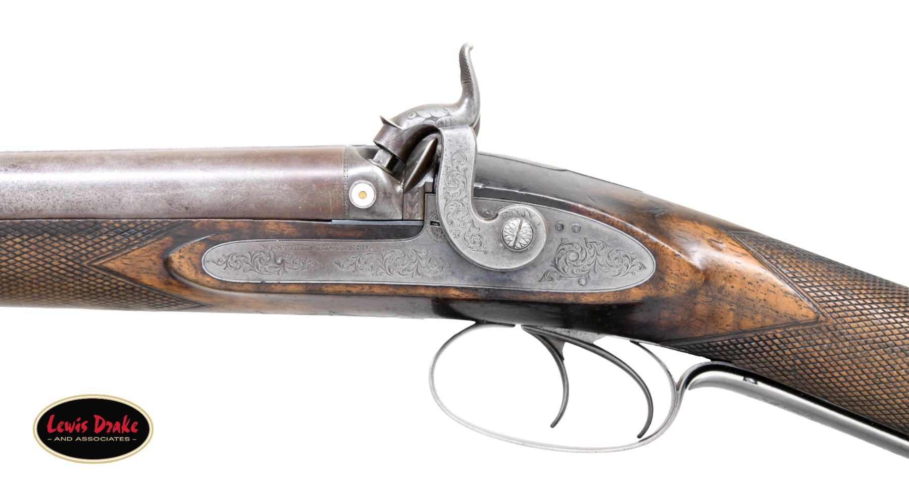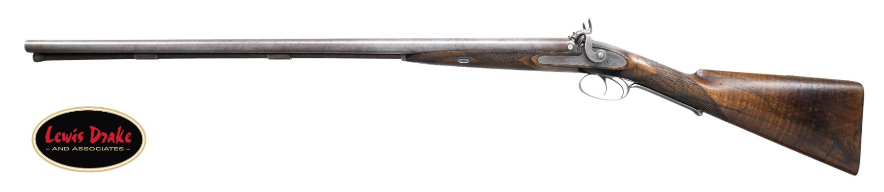 Cal. 16 Bore. S# 9703 (Circa 1858). The 30" laminated steel barrels are engraved "WESTLEY RICHARDS 170. NEW BOND St. LONDON" on broad game rib. Bottoms of barrels are stamped with Birmingham black powder proofs and S#. Breeches have platinum blowouts. Breech iron is nicely scroll engraved and stock has silver flash guards. Front spring island type locks with tall flat faced serpentine hammers are engraved with well cut open scroll. 'WESTLEY RICHARDS" is on each lockplate. Trigger plate has pineapple finial and steel trigger guard is fitted with grip safety device which locks triggers until squeezed. Straight grip stock of fiddle figured and lightly streaked European walnut measures 14-3/8" over steel buttplate with long scroll engraved top tang. Stock attaches to barrels with single side bolt through oval silver escutcheons and has point pattern checkering at grip and forend. A vacant silver oval is on toeline. Original walnut ramrod with horn tip and brass tail mounts through two plain pipes and pineapple type thimble. MEASUREMENTS: BBLS: Bore Diameter: L .669. R .669. Restriction: L .000. R .000. Wall thickness: L .037. R .033. STOCK: DAH: 2-1/4". DAC: 1-5/8". CAST: neutral. LOP: 14-3/8". WEIGHT: 6 lb. 4 oz. CONDITION: very good. Barrels retaining about 40% original brown. About 30% case hardening color remains on locks. There are traces of blue on trigger guard and buttplate tang. Stocks show considerable wear to their original surfaces with many scattered marks. Bores are exceptional; smooth, bright and shiny. Locks are crisp. Consignor states that this was Lynton MacKenzie's favorite shotgun. Lynton was possibly the most gifted engraver of our time and had a genuine love of muzzleloaders; especially flintlocks. He died in 1999 at the age of 59. PROVENANCE: from the renowned collection of quality sporting arms from Lewis Drake together with inventory of Lewis Drake Associates. (01-26125/MGM). ANTIQUE. $3,000-5,000.
