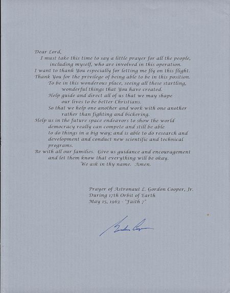 (b. 1927) American astronaut, a member of the original seven Mercury astronauts, commander of Gemini 5. T.Q.S., 1p. 8vo., a prayer signed by Cooper during the 17th orbit of earth, May 15, 1963, while aboard the Mercury Atlas ("Faith 7") spacecraft, which was the last Mercury space mission. Fine.
