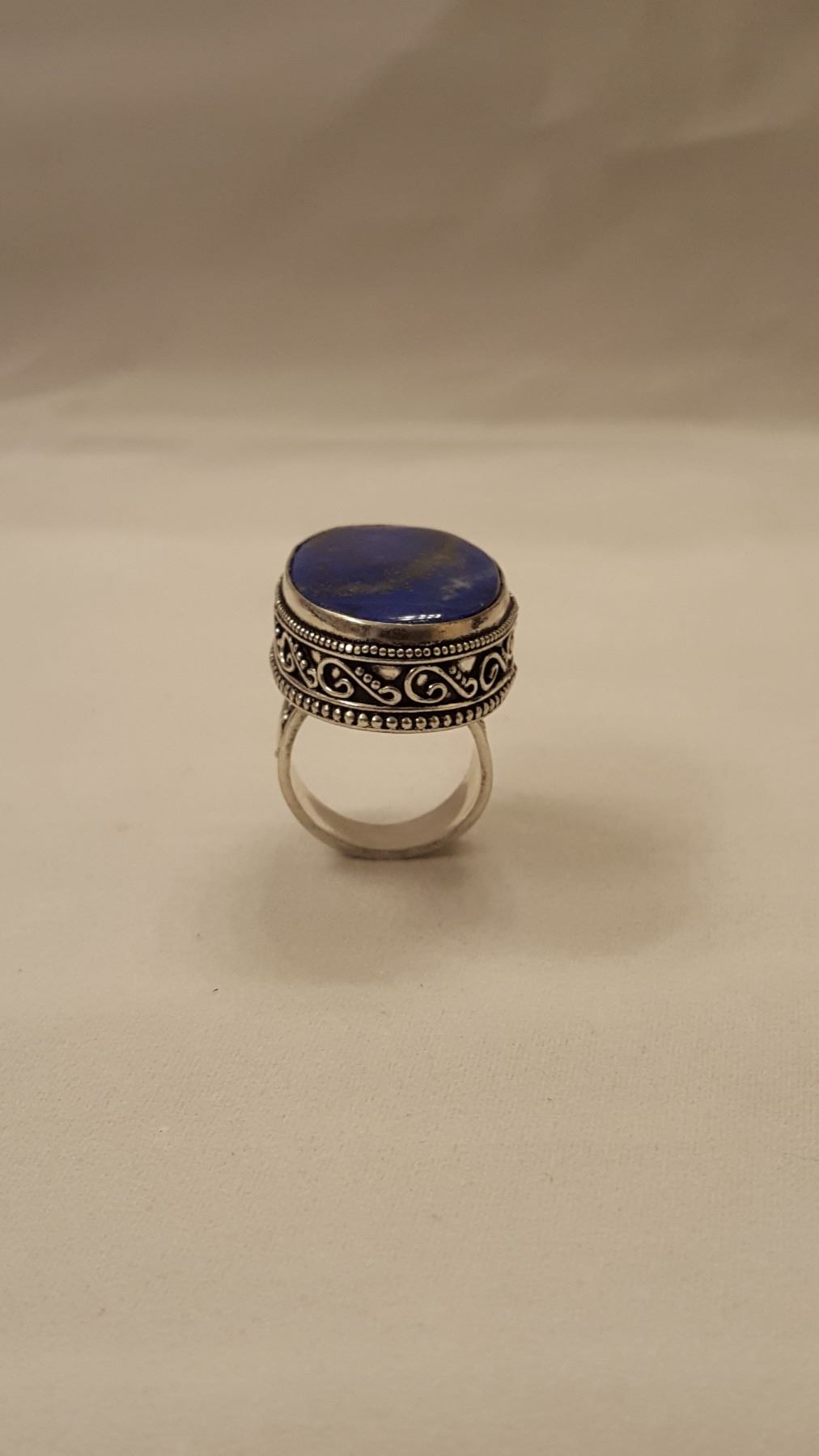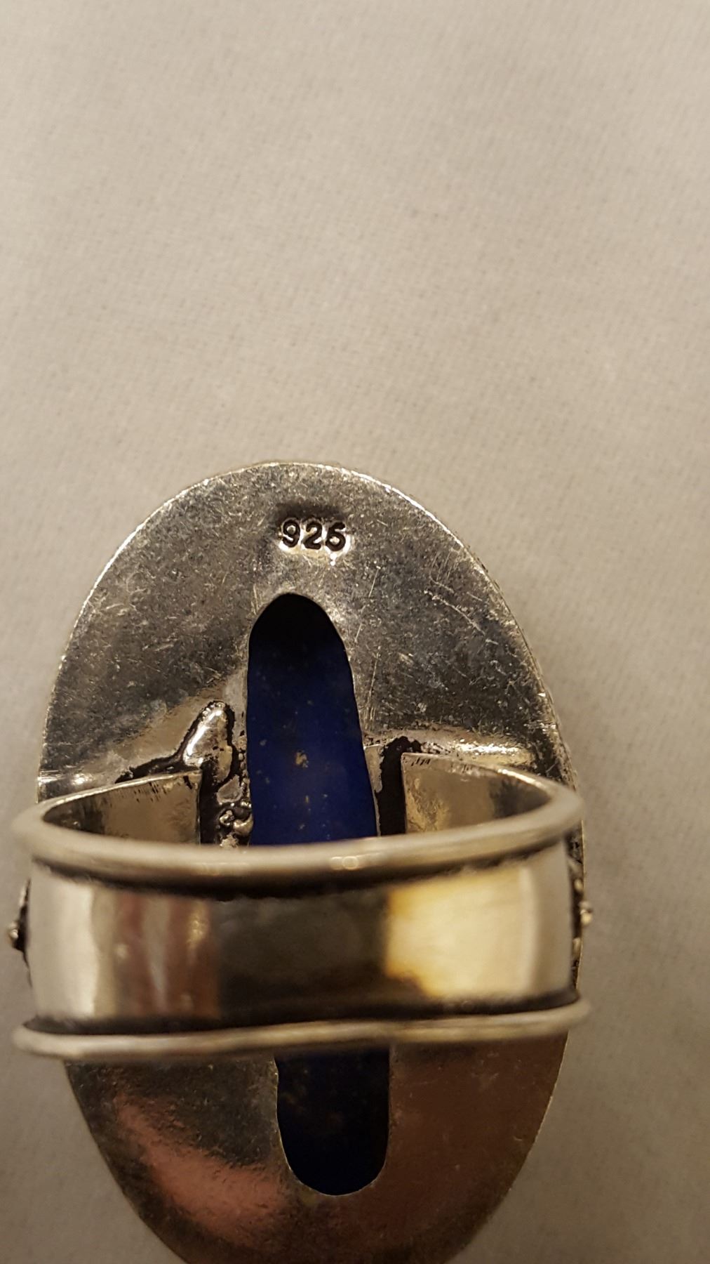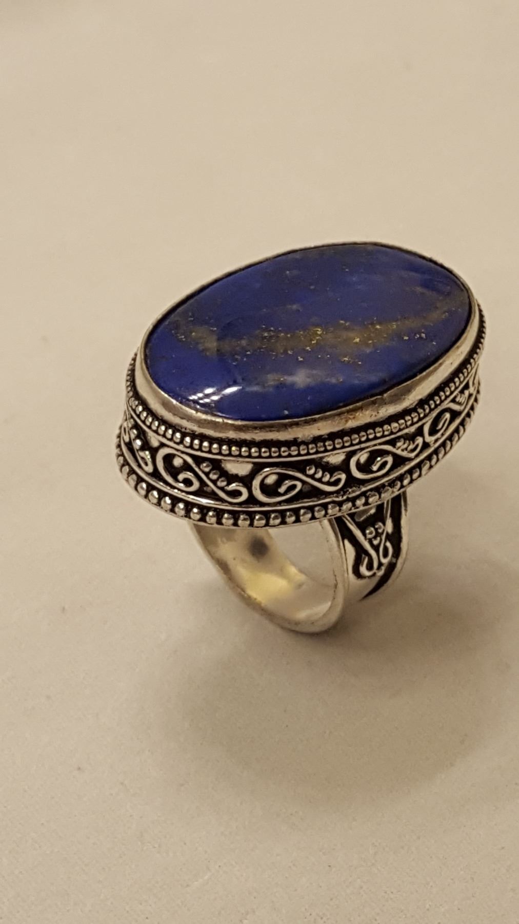 GORGEOUS 16.75 CT BLUE LAPIS LAZULI RING. MOUNTED IN  ELABORATELY DESIGNED .925 SILVER SETTING. APPROXIMATE SIZE 7. HUGE 81.50 CTTW