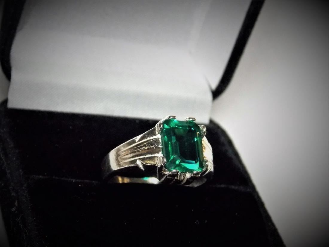 GORGEOUS 5 CT VVS1 EMERALD RING. THIS LAB CREATED EMERALD RING IS NEAR FLAWLESS. BEAUTIFUL EMERALD CUT MOUNTED IN ELABORATELY DESIGNED SOLID .925 STERLING SILVER SIZE 8. THE TOTAL GRAM WT IS 5 GRAMS. THIS RING IS BEAUTIFUL AND HAS THE SAME CHEMICAL COMPOUNDS AS A MINED FROM THE EARTH EMERALD. Be3Al2(SiO3)6