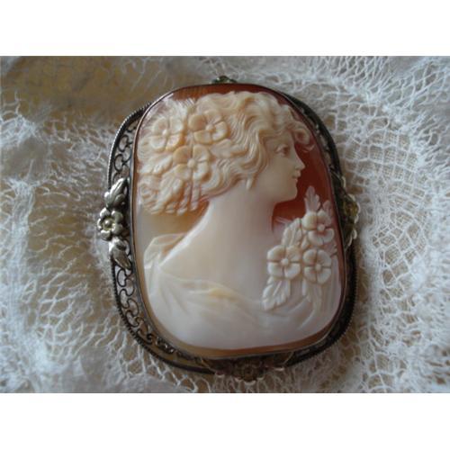 Beautiful large antique hand carved cameo of a beautiful lady. Highly detailed and lots of raised carving. Its stunning! The shell cameo is in excellent condition-no chips or cracks or repairs. Its set in filigree sterling silver , can be worn as a broach or pendant which is on a clever hinge. The cameo broach measures about 1 3/4 inches by 1 1/2 inches. A most remarkable antique cameo broach to enjoy wearing and adding to your collection of antique jewelry.