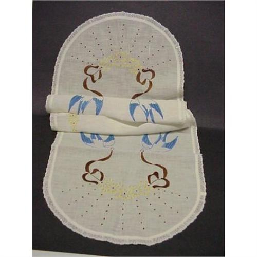 HAND EMBROIDERED ANTIQUE RUNNER DEPICTING FLOWERS AND 2 BLUE BIRDS, EDGED WITH THE FINEST LACE TRIM - LOVELY! - EXCELLENT CONDITION, FREE OF DAMAGE, MEASURES 35" X 12 3/4" WIDE, US BUYER PLEASE PAY 3.00 FOR INSURED SHIPPING.THANKS FOR LOOKING!