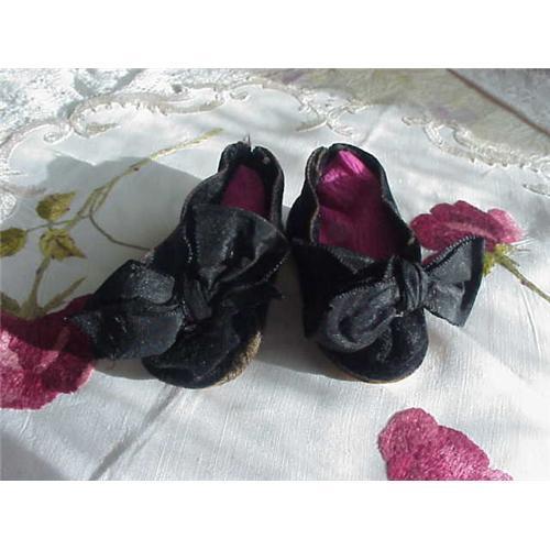 These are adorable! The little shoes are black velvet silp on type shoes with their original silk bows. They may be French or German, the one sole is marked number 5, the other shoe lost its sole but still is wearable and most presentable. These cute shoes measure 2 3/4 inches and are 1 1/4 inches wide, could fit a more wider or narrow foot. In remarkably top condition! What a prize addition to your antique dolls collection.