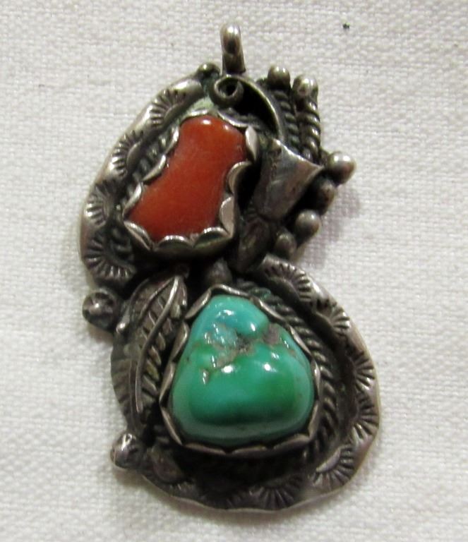 WITH RED CORD AND TURQUOISE STONE ACCENTS. MARKED "SC". TOTAL 5.4 DWT