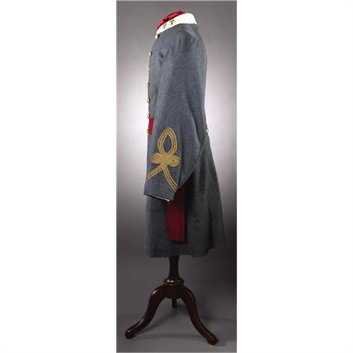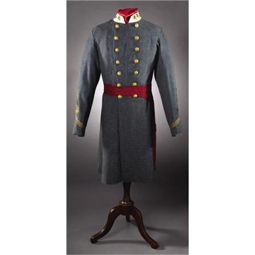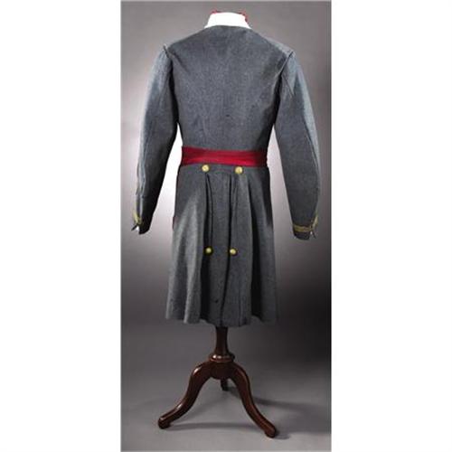 <B>SUPERB CONFEDERATE LIEUTENANT COLONEL OF STAFF OFFICER’S REGULATION FROCK COAT AND SASH.</B></I> Cadet gray wool with 1 ¾” high buf wool faced stand up collar. Two 1 ½” five pointed star affixed on each side of the collar. Significantly the attachment wires of the stars are not visible on the inside of the collar and they were clearly attached before the buff facing was stitched in place. The sleeves exhibit outstanding period sleeve cut, measuring 9 ½” at the elbows and 5” at the split cuffs. 3 strips of ¼” bullion tape quatrefoil, per regulation, on each sleeve. Seven button double breasted front with Yankee staff buttons. Seven of the buttons have the “Extra Quality” backmark, six are “Waterbury Button Co. Extra” and one “Steele & Johnson”. The buttons all appear to be original to the coat. Interestingly there is evidence on the right breast, 2” to the side of the existing row of buttons where another row of buttons was once affixed, the owner apparently losing girth during his period of service. The striking brown, red, white and blue plaid lining is draped throughout, no quilting. The sleeve linings are white cotton. And there is a small, 2 ½”, pocket in the left breast edged with white cotton. The red silk sash is 2 ½” wide and is rather unusual, although typically Confederate, having 2 ½” flat woven caps on the 8 1/2” tassels. The sash has always been with this coat. A handsome and rare regulation Confederate frock coat worn by a high ranking staff officer.<BR><BR><B>PROVENANCE: </B></I><I>Headley Collection</B></I><BR><B><BR>CONDITION:</B></I> Body with a number of small moth holes, several with old stitched repairs, which detract little and simply testify to the coat’s great age. Wool lining also w/some scattered moth holes but excellent and very sound. Buttons show no signs of being restitched and all appear to be original to the coat. Cotton sleeve linings perfect. With the exception of a few small areas where the stitching has popped the bullion quatrefoil is tight. Brass button and collar stars with nice patina, retaining much of the original gilt. The sash is perfect.<BR><BR><b>Shipping:</b> Clothing, Costumes & Jerseys (<a target="_blank" href="http://www.heritageauctions.com/common/shipping.php">view shipping information</a>)