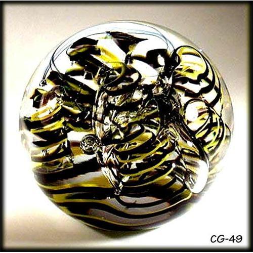 This is truly stunning piece of Art glass!!! Black and yellow "seaweeds" in spirals with floating bubbles are spectacular. The picture doesn't convey the incredible feel of quality that comes from holding it! Mint condition, no chips, scratches or repairs. Dimension : 3" in diameter, Princ Studio, Artist engraved signature : Krcil 99.