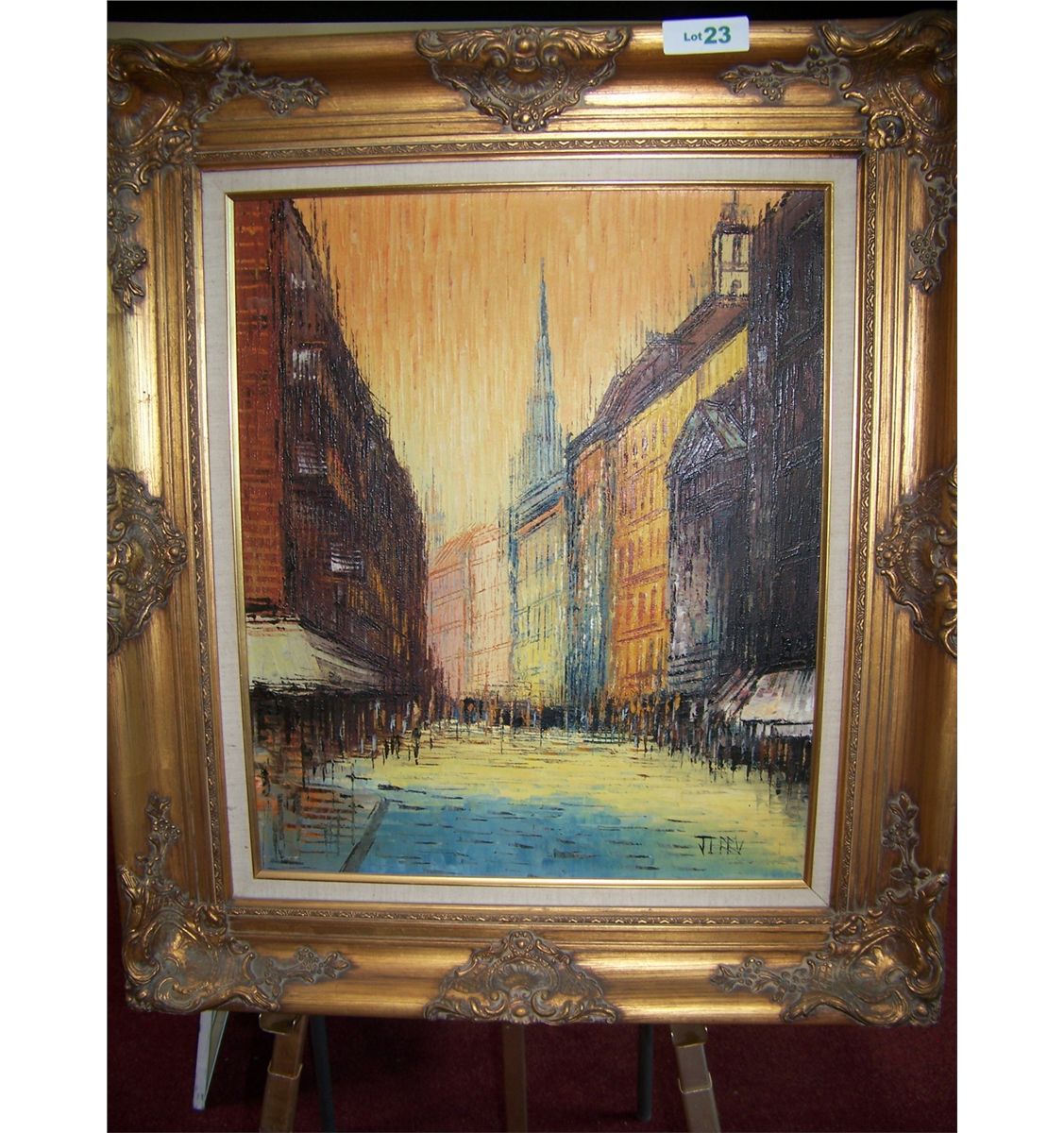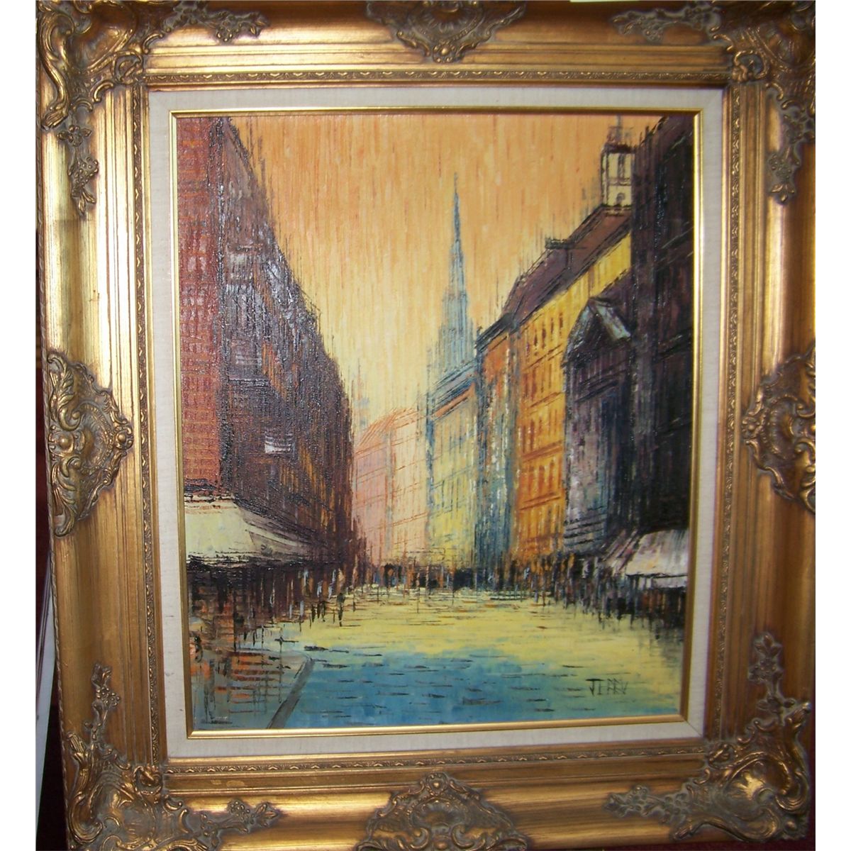 GORGEOUS FRENCH MID CENTURY SIGNED OIL ON CANVAS PAINTING, SIGNED JIFFY. GALLERY FRAMED