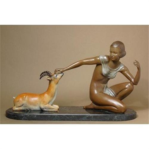 GORGEOUS GIRL AND IMPALA ART DECO BRONZE SIGNED SCULPTURE