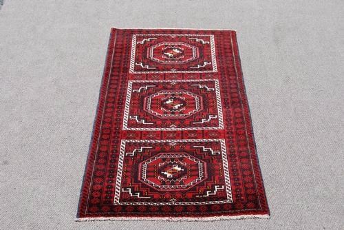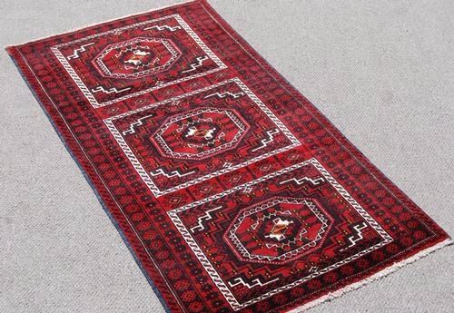 GORGEOUS HAND MADE PERSIAN TURKMAN RUNNER. SIZE 3.6 X 6.9 FEET, MADE OF FINE QUALITY BABY LAMB'S WOOL PILE ON COTTON FOUNDATION, ALL NATURAL VEGETABLE DYE, INCORPORATES A LOVELY SET OF TRIBAL MOTIFS ON A RED and DARK BACKGROUND WITH A CENTER ROW OF THREE LARGE MULTI LAYERED MEDALLIONS AND ENCAPSULATED NICELY BY AN INRICATELY DONE BORDER. HAND WOVEN IN Iran.
