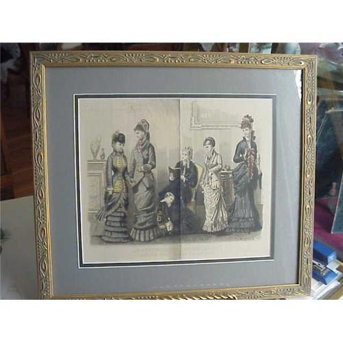 Beautiful double matted & framed antique Ladies FASHION ENGRAVING dating from the 1870s. The engraving is hand painted when originally printed, the colors are beautiful! It measures 16 inches by 14 1/2 inches; the gold textured finished wooden frame is in very nice condition . A lovely antique picture to decorate with! If you enjoy collecting antique and vintage lace and linens, barkcloth, all things roses, Limoges & English china,Shabby Chic, Romantic Cottage and Paris Apartment décor , you may wish to bookmark us since we list often. Thanks and enjoy your day!
