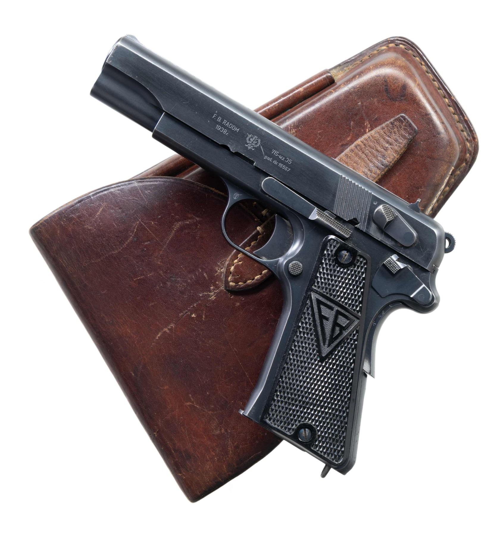 ORIGINAL HOLSTER. Cal. 9x19mm. S# 21610. Bbl. 4 1/2". The Radom factory made approx. 50,000 Polish eagle Radoms before WWII German occupation. This high condition example made in 1938 has the usual slide address on the left side referencing mfg., model, year of production, and patent #. Left upper trigger guard with the encircled "B/ 8" acceptance. Full S# on right side of the frame with disassembly showing a matching bbl., slide, and extractor. Fitted with crisp original "FB/ VIS" checkered border grips, each panel secured with a pair of fire blued screws. Original rust blued mag. an encircled "G/ 2" on the toe. MAGS: 1 8-rd. UANTTACHED ACCESSORIES: original holster whose "D" shoulder strap rings and narrow belt loop were replaced by a pair of broader and larger belt loops riveted in place. CONDITION: pistol is 97-98% bright original rust blue with muzzle wear, minimal sharp edge wear, and the usual spot of holster wear on the front strap. Comparable condition fire blued extractor and screws. Equally crisp original grips. Near mirror bore. Correct manual mechanics. VG holster with strap replacement on obverse surface as detailed and pictured. A beautiful rig by any metric! (25-3526/LMA). CURIO. $9,500-13,500.