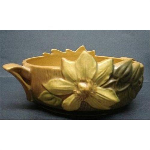 HERE IS MOST BEAUTIFUL AUTHENTIC ROSEVILLE,CLEMATIS BOWL, DEPICTING MAGNIFICENT,LARGE CLEMATIS BLOSSOMS,IT IS PROPERLY SIGNED AT THE BOTTOM,as per images - Measures from handle to handle about 8 3/4" x 6 1/2" x 3" high,Very fine condition,but for small paint off chip on one of the leaves and there is pin head factory blister-paint off- not even worth mentioning but for the accuracy of the description - US Buyer to pay 9.00 for shipping plus insurance,THANKS.