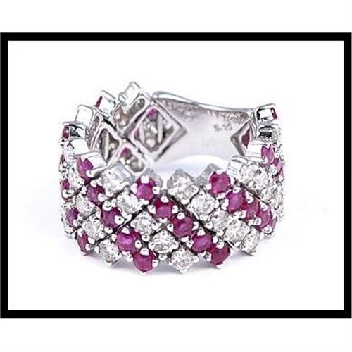 The superb workmanship of this gorgeous ruby diamond ring makes the ring flexible and extremely comfortable to wear. The deep red hue of the rubies contrast magnificently with the bright, white radiance of the diamonds. The 37 rubies weigh 3.25 carats and the 37 diamonds weigh 2.00 carats. It weighs 10.00 grams, and measures 11mm (7/16 inches) wide.