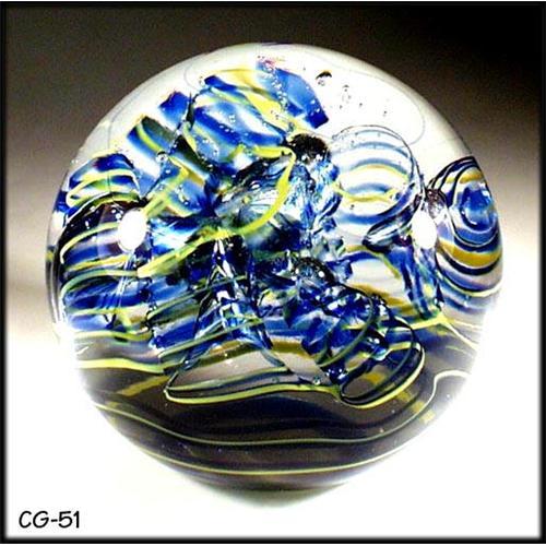 This is truly stunning piece of Art glass!!! Cobalt blue and yellow "seaweed" ribbons in spirals with floating bubbles are spectacular. The picture doesn't convey the incredible feel of quality that comes from holding it! Mint condition, no chips, scratches or repairs. Dimension : 3" in diameter, Princ Studio, Artist engraved signature : Krcil 99.