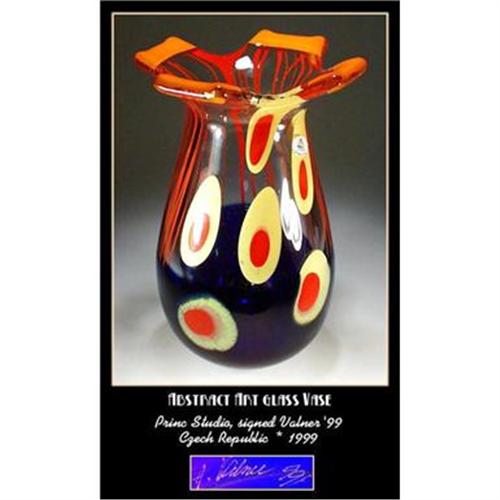 This outstanding Art glass vase has it ALL!!! Colorless glass encased with transparent cobalt blue on lower part is fused with red, orange and yellow segments. The base is hand cut, polished and signed in script A. Valner 99, also PRINC Studio, Bohemia Glass label. Dimension : approximately 9-1/2 inches high. MINT condition, no chips, cracks or repairs. Matching Valner centerpiece is available, please see our other Auctions - or photo CG096. For Ebay Live Auction, please email for larger, more detailed photo