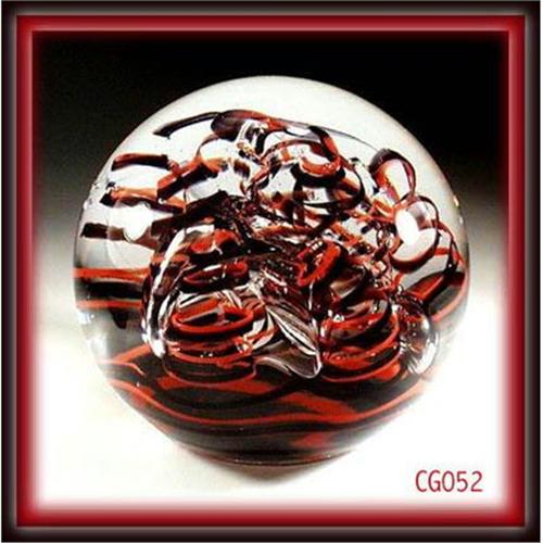 This is truly stunning piece of Art glass!!! Red and black "seaweed" ribbons in spirals with floating bubbles are spectacular. The picture doesn't convey the incredible feel of quality that comes from holding it! Mint condition, no chips, scratches or repairs. Dimension : 3" in diameter, Princ Studio, engraved signature : Krcil 99.