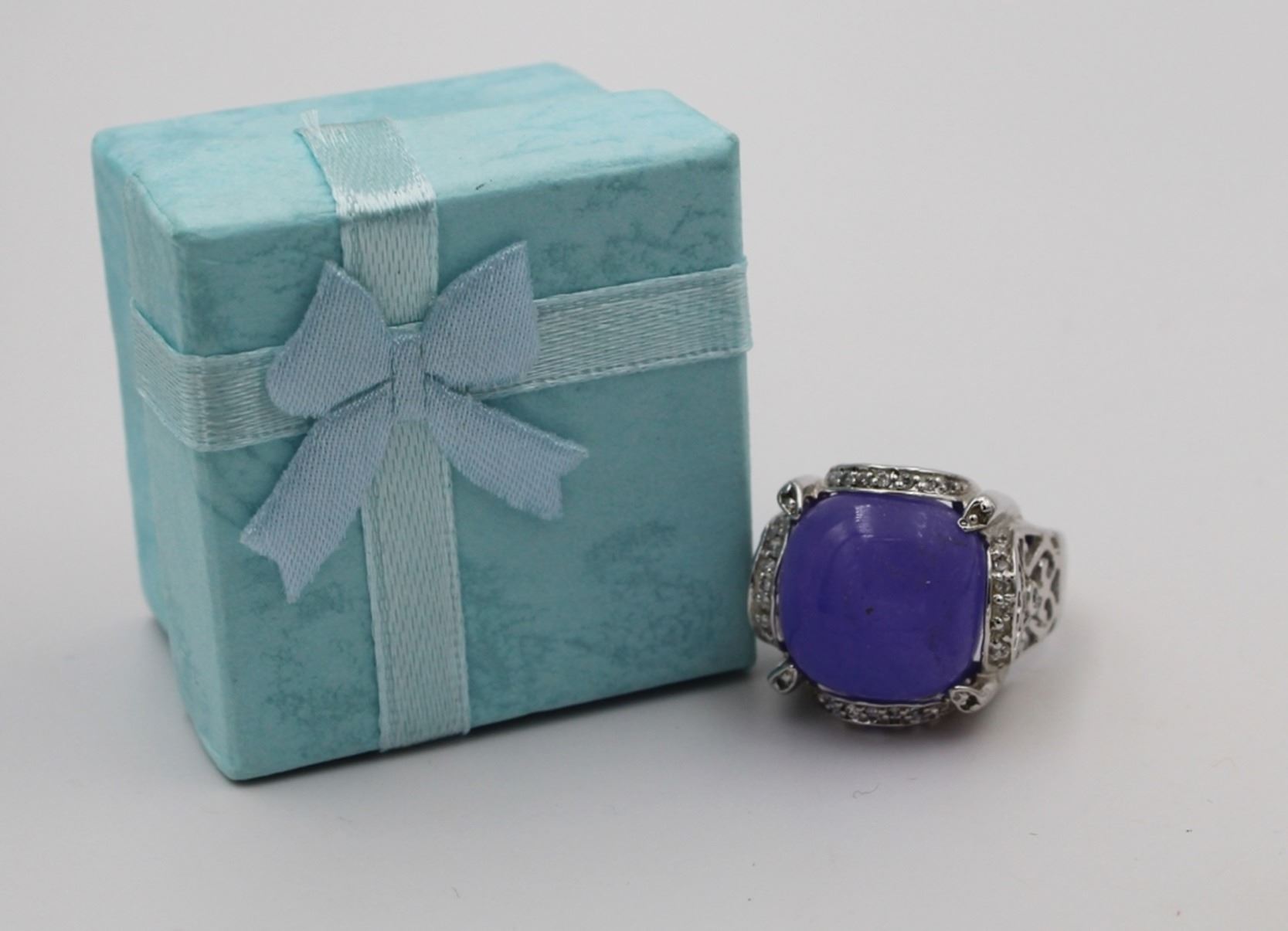 GORGEOUS STERLING SILVER AND PURPLE RING. CZ AND CUTOUTS IN THE BAND AND MOUNT. SIZE 9.5. 10.1 GRAMS. PRE-OWNED. ESTIMATE: $60-$80