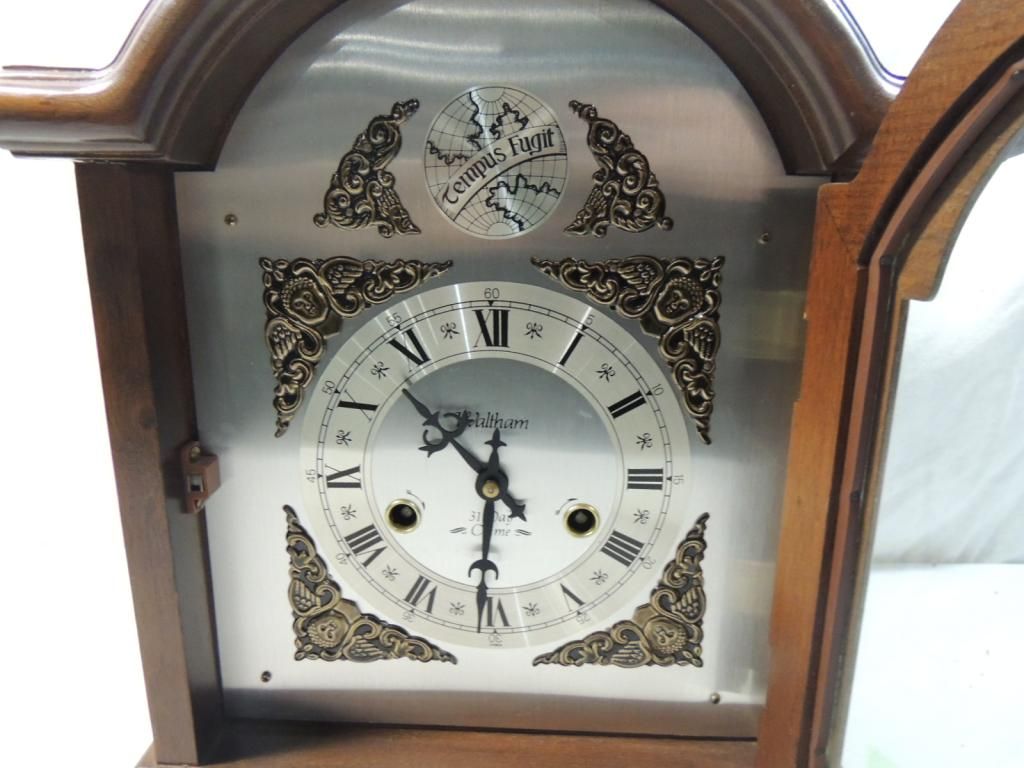 BEAUTIFUL CHIMING CLOCK. TABLE TOP DECK TOP MANTEL CLOCK. WALTHAM 31 DAY CHIME TEMPUS FUGIT. STUNNING DETAILS. SURROUNDING CLOCK FACE ANGELS CHERUBS MOON. MAN IN THE MOON. MAKE YOUR HOME COMPLETE WITH THIS CLASSIC TIME PIECE. AS SHOWN SEE PHOTO FOR MORE D