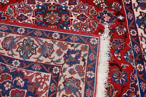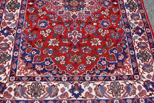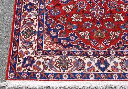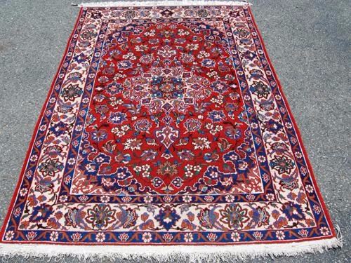 VERY GORGEOUS DEEPLY DETAILED PERSIAN NAJAFABAD. SIZE 6.9 X 4.10 FEET, MADE OF FINE QUALITY LAMB'S WOOL PILE ON COTTON FOUNDATION, ALL NATURAL VEGETABLE DYE, INCORPORATING A DEEPLY DETAILED FLORAL PATTERN ON A RICH RED BACKGROUND; BEAUTIFUL TEARDROP CENTERPIECE MEDALLION; FINELY DONE CROWNED CORNERS AND AN INTRICATELY DONE FLORAL BORDER. HAND WOVEN IN NAJAFABAD, Iran. AS A RESULT OF THE HANDMADE WEAVING PROCESS, NOT ALL SIDES MAY BE STRAIGHT OR CORNERS SQUARE.