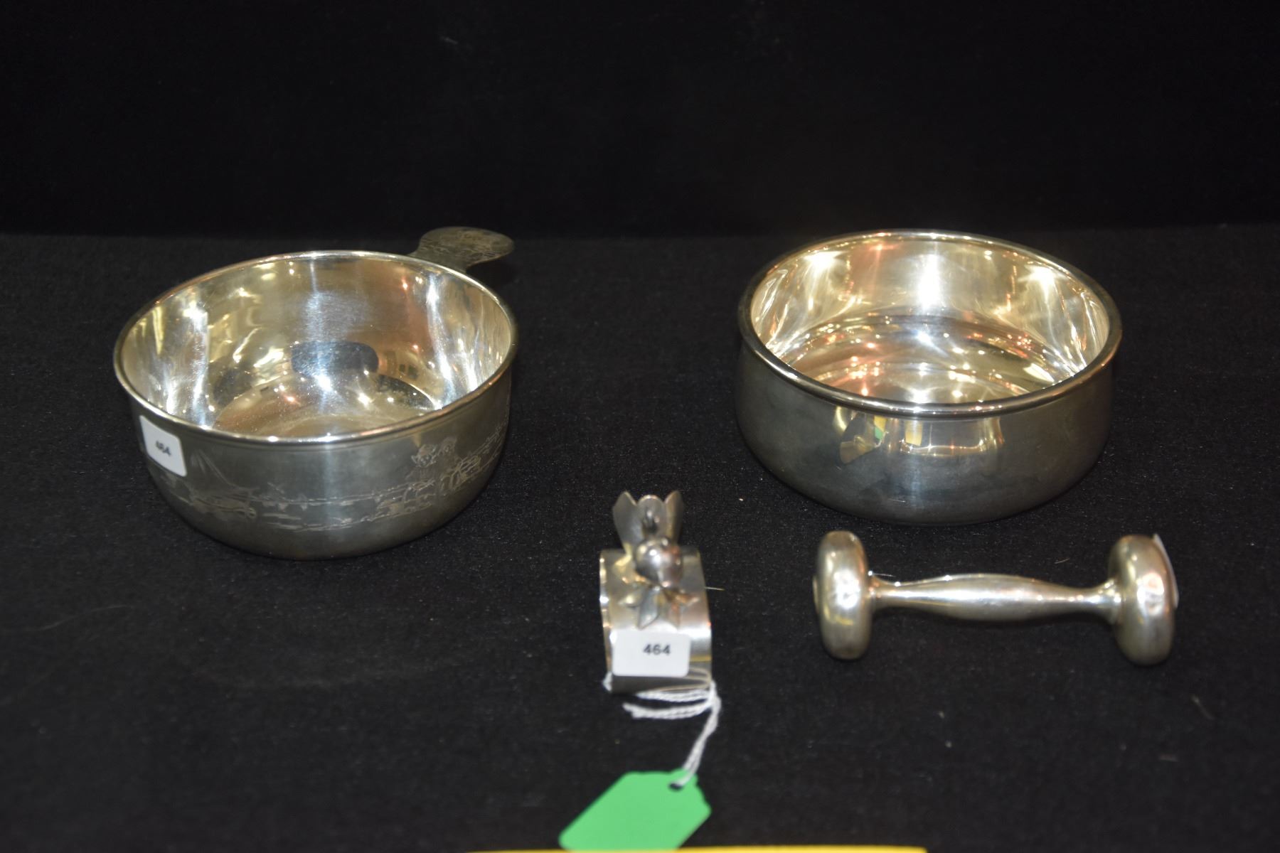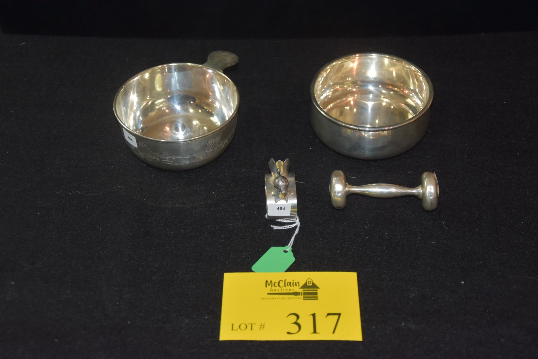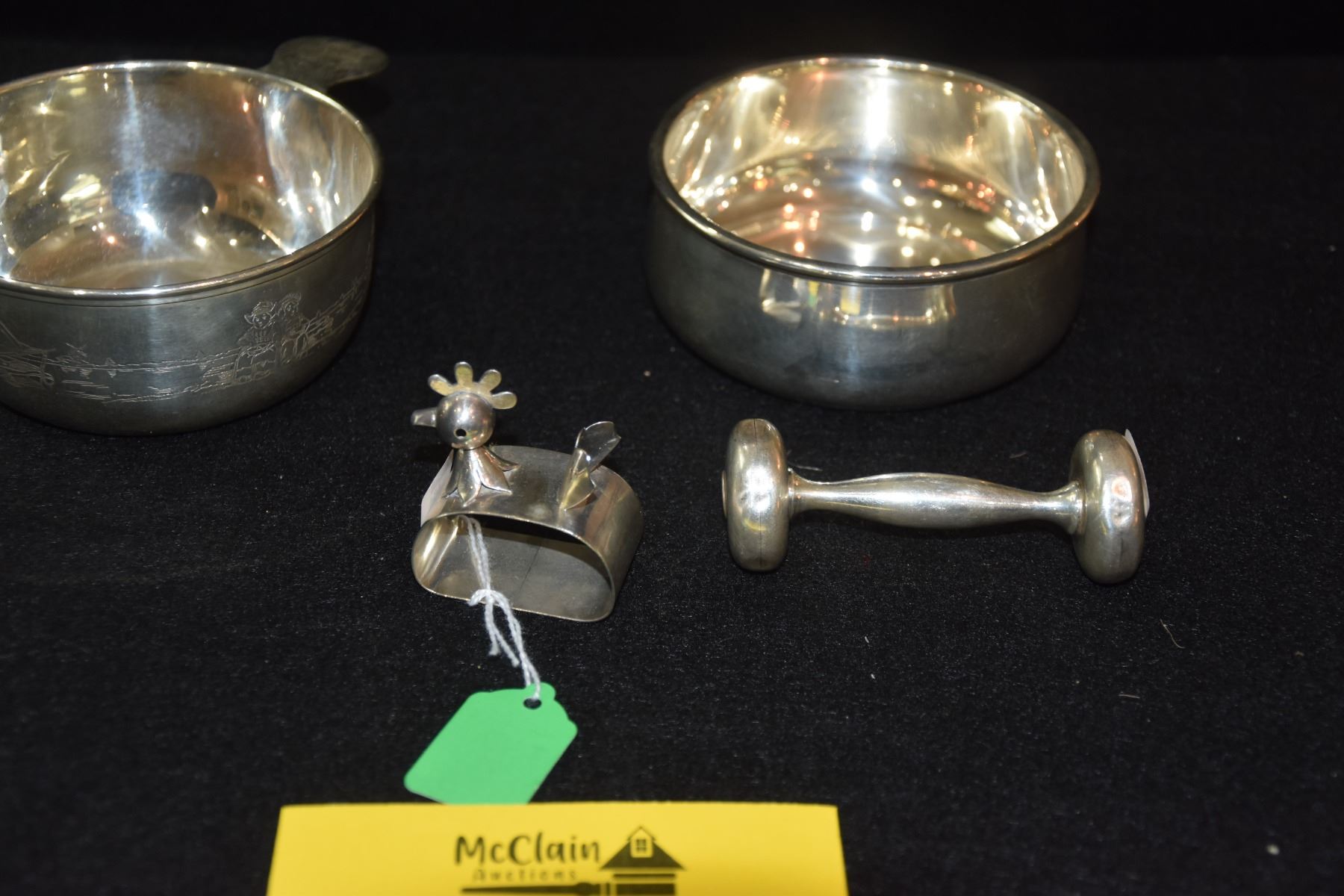 GORHAM STERLING PORRINGER BOWL, STERLING CHICKEN NAPKIN RING, TOWLE STERLING RATTLE & STERLING CHILD