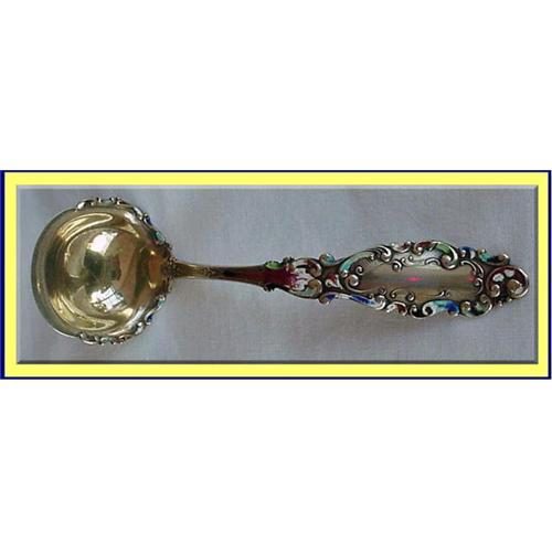Antique Gorham sterling silver, gilt washed and enamelled ladle. Rare luxury enameled Luxembourg pattern. Made in USA, issued in 1893.<BR>Measures 5 1/2 inches in length. Almost helmet shaped with visor for ease of manipulating food and frilly scrolling trim around the sides. Arching handle. Repeated scrolls and raised decoration, enamelled in red, green, blue, white and blue-green.<BR>Unusual in that the back is also enamelled. Hallmarked with the first Gorham mark (lion, anchor and G) and STERLING.<BR>Good condition.