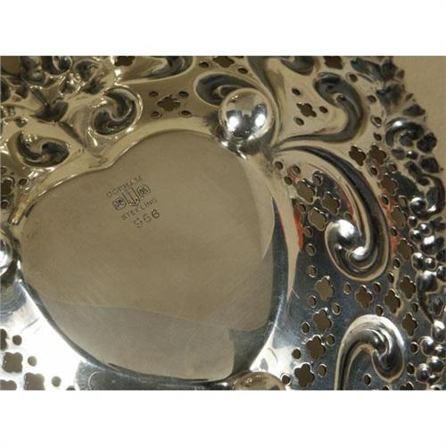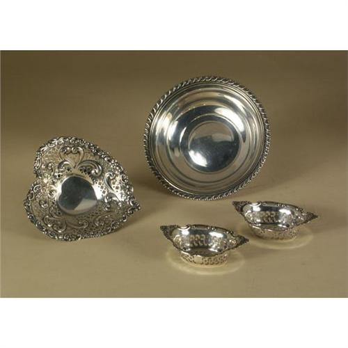 STERLING: A lot of assorted sterling silver items including a round bon-bon or nut dish 6'', gadroon lip, hallmarked; a Gorham sterling heart-shaped highly reticulated candy dish, 4.75'' x 4.5, and; two individual style reticulated Gorham sterling nut dishes, 3.25'' x 2.5'', total 6.45 ozt.
