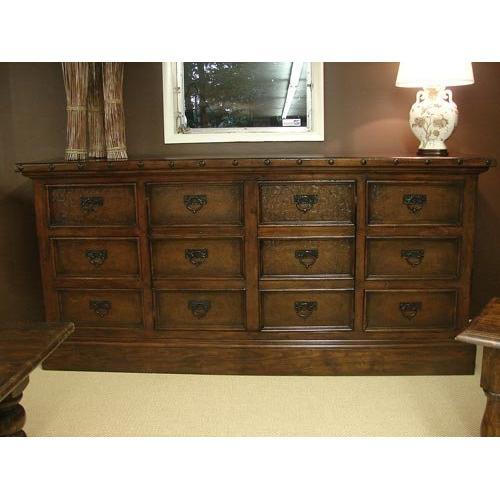 WHAT AN OUTSTANDING PIECE!! ITALIAN EMBOSSED LEATHER INLAY TO EACH DRAWER AND ALSO TO THE INTERIOR OF THE DOORS THAT OPEN. ACCENT WITH HEAVY CRAFTED BLACKSMITHS IRON HARDWARE AND HEAVY STUDDING TRIMMED TO THE TOP EDGE. THIS HAS ON OLD WORLD RUSTIC FEEL AND COULD BE USED AS A LARGE CHEST OF DRAWERS, AN ENTERTAINMENT CENTER OR A LARGE SERVER BUFFET! A VERSATILE AND GORGEOUS PIECE TO SAY THE LEAST!