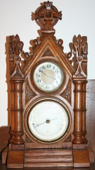 GOTHIC STYLE, OAK WALL CLOCK & BAROMETER, C.1920, H 24in, W 10in:having a classic Gothic design carved oak case with Celtic Revival Cross finial at the top of a gable flanked by Fleur de Lis atop turned half round spindles; a metallic face with Arabic numerals with central brass disk with designs in relief, bevel glass over face, brass bezel; bottom dial is a barometer with brass bezel, also with bevel glass