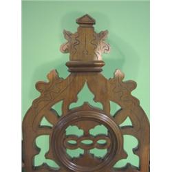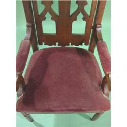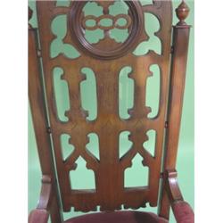 GOTHIC WALNUT I.O.O.F. LODGE ARM CHAIR. Ornately carved. Circa 1850-1870. Red velvet upholstery. 70.25" H to top of back, 21" H to top of seat, 26.5" W