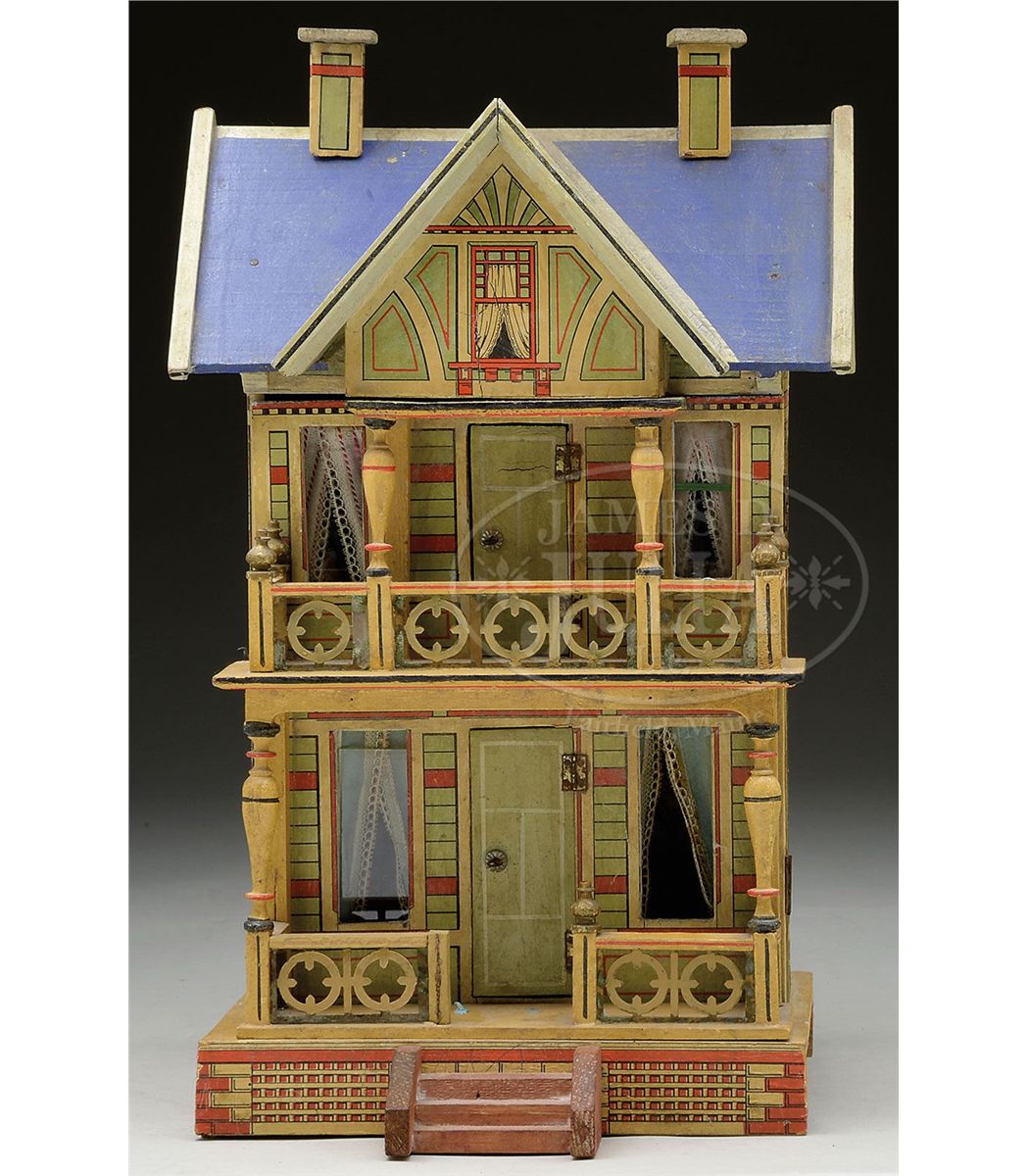 A very fine example of a paper litho sided Gottschalk blue roof house originally sold to the French market as Deauville. Circa early 20th century. Appropriately marked in pencil on the bottom with "7/6" as well as what appears to read "3370". An elaborate 1st and 2nd floor railings add to the charm of this house. Interior retains its original floor coverings as well as wallpaper. Paper throughout is in excellent condition, however house could use a good dusting/cleaning. Right side of base with simulated lattice cover on wood is missing. Front steps are older replacements. Interior has a fair amount of furnishings along with china figurines, all of newer vintage than house itself. SIZE: 10-1/2" w x 8-1/2" d x 19" t. CONDITION: Replacement to left lower porch railing, some touch up repaint to metal grill work on railings. 1-13349