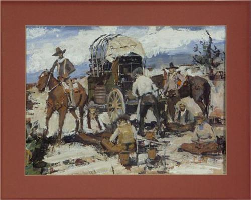 GOUACHE ON PAPER 13'' x 17'', James Lee Colt (1922-2005), California/Arizona. ''The Red River Livestock Company''. Signed lower right. Matted/Unframed. Colt studied at both Otis and Chouinard Art Institutes. He attributes his focus on western themes to his family history. More info. in the white binder.