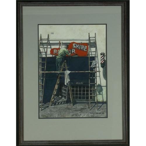 GOUACHE 21 3/4'' x 16'', James McFarlane. ''Shoe Repair''. Signed and dated '1981' lower right. Kirsten Gallery label on the verso. Double matted and placed in a blue-washed wood frame. In addition to teaching watercolor painting, McFarlane is very active in a number of watercolor societies and contributes to national watercolor magazines. More info. in the white binder.