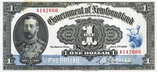 GOVERNMENT of Newfoundland. $1.00. NF-12d. Jan. 2, 1920. No. A142666. PCGS graded Apparent Extra Fine-40. Small tear in upper right margin. Minor staining. Scarce in high grade.
