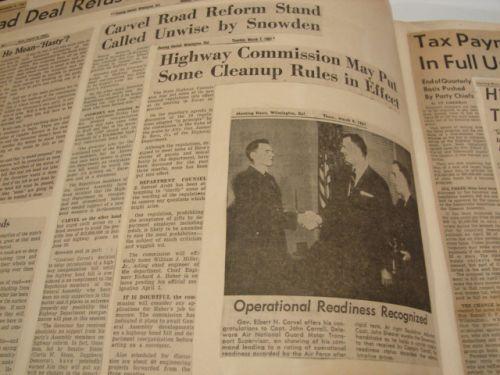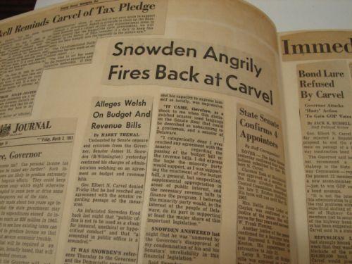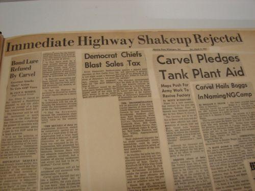 GOVERNOR ELBERT N. CARVEL SCRAPBOOK.  Scrapbook spans part of Governor Elbert N. Carvel's (Governor of Delaware 1949-1953, 1961-1965) political career.  Scrapbook begins in March 1961 and ends in August 1961.  Scrapbook consists of newspaper clippings, programs, & invitations.  Scrapbook was put together by Mrs. Ann Valliant Carvel.