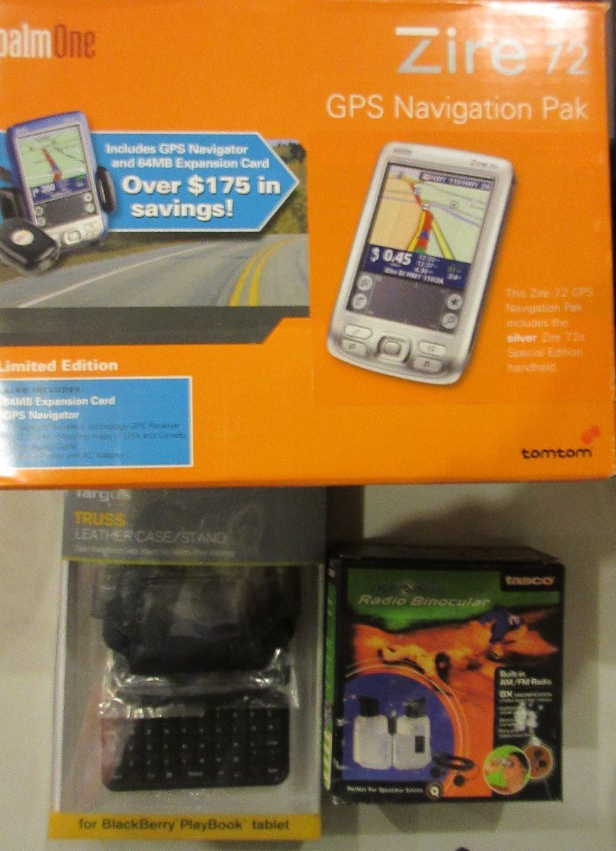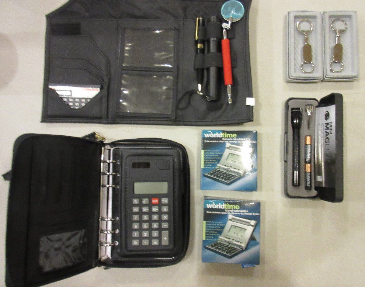 Ready to travel with a binder for your vehicle which holds Registration and Insurance comes with Pen Flashlight, a zipped organizer, 2 worktime Travel Calculator, calendar and clock combo, 2 key chains, Mini Magnalite, Palm one GPS system, Keyboard for Blackberry Play Book and Tasco Radio Binoculars